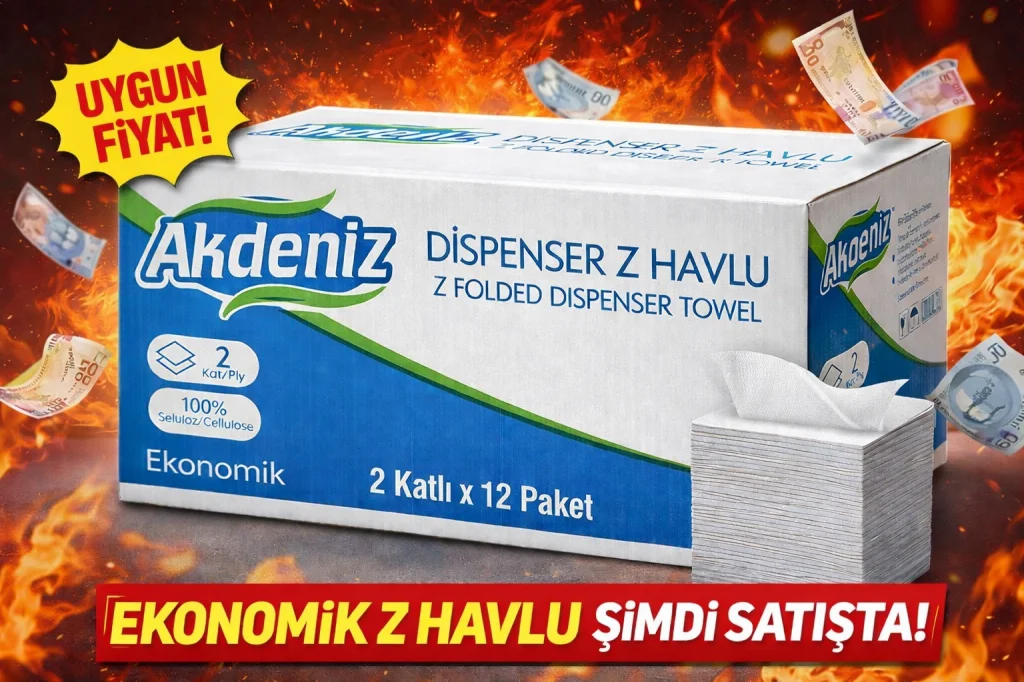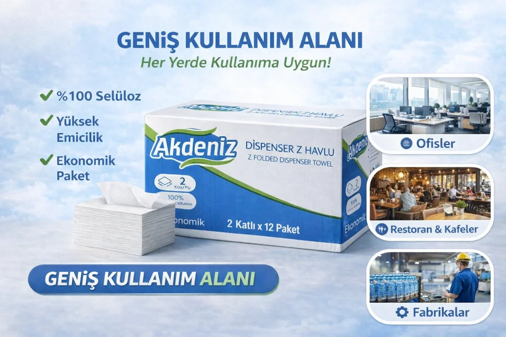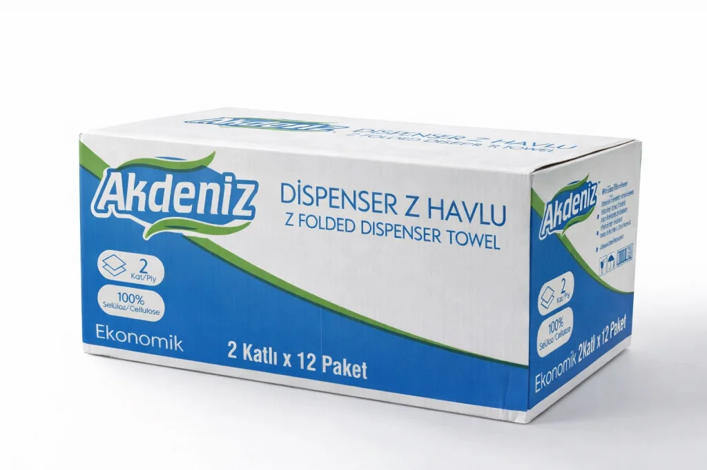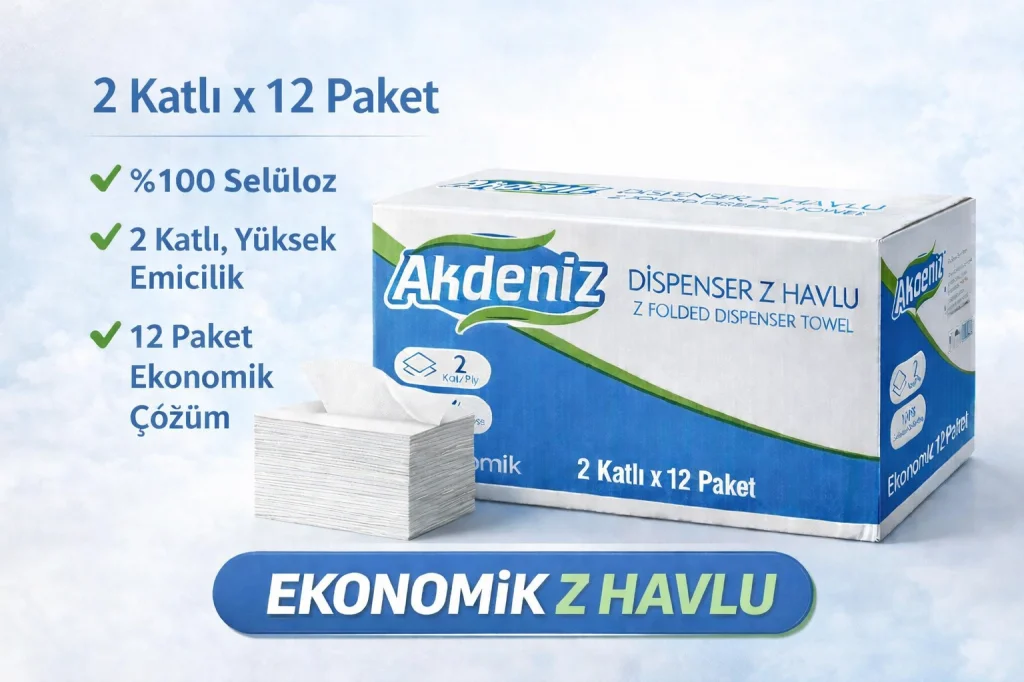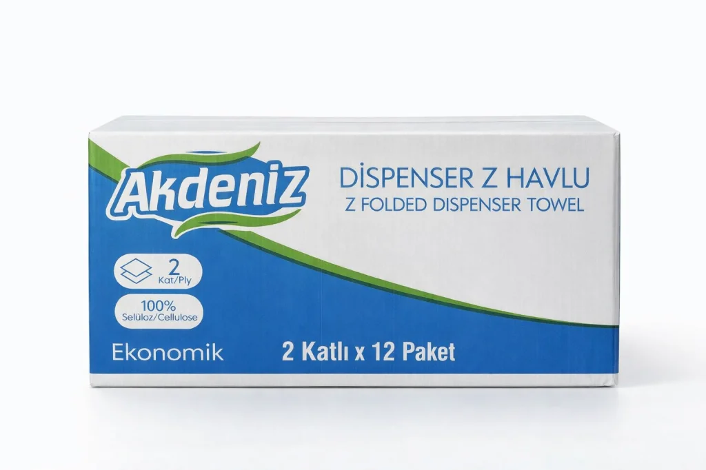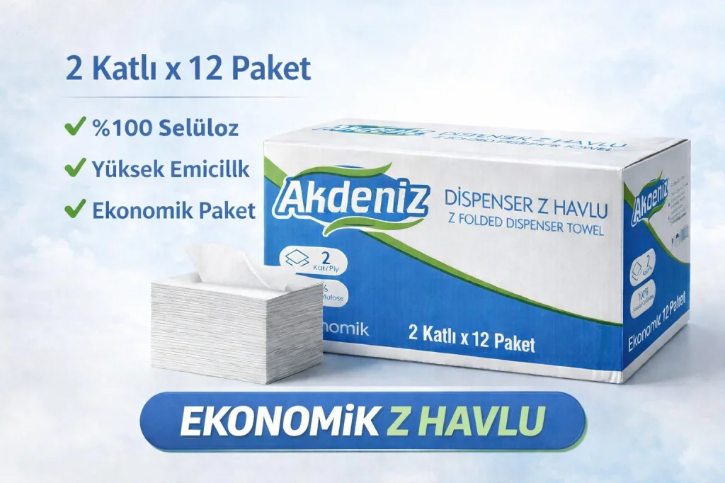 Akdeniz Dispenser Z Havlu 2 Katlı 12 Paket | %100 Selüloz | Ekonomik Z Katlı Kağıt Havlu Akdeniz Dispenser Z Katlı Kağıt Havlu, yoğun kullanıma uygun yapısı ve ekonomik paketiyle işletmeler için ideal bir çözümdür. 2 katlı yapısı, günlük kullanımda etkili emicilik sunarken, %100 selüloz içeriği ile hijyenik ve güvenli kullanım sağlar. Dispenser uyumlu Z katlama formu sayesinde tek tek çekilerek israfı azaltır, maliyet avantajı sağlar. ? Ürün Özellikleri