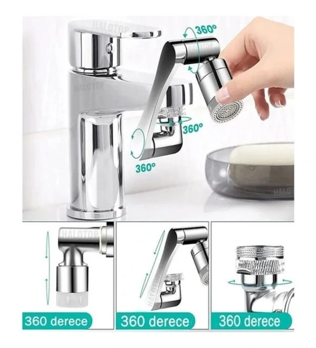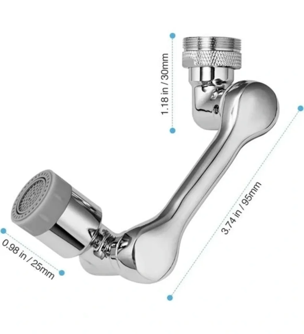 AKROBAT MUSLUK BAŞLIĞIHer Köşeye Ulaşan Temizlik, 1080° Çok Yönlü Döndürme ile1080° çok yönlü döndürme robotik kol tasarımı, su akışının lavabonun her köşesine ulaşmasını sağlayan toplam üç adet 360° dönüş arayüzüne sahiptir. Musluk havalandırıcı, iki su çıkış modu arasında geçiş yapabilme özelliği ile sıçramadan yumuşak kabarcık akışı elleri yıkamak için idealdir ve basınçlı sprey ise bardakları durulamak için uygundur.Bu ürün, metal görünümlü yüksek kaliteli ABS plastikten üretilmiştir ve aletsiz kurulum imkanı sunar; elle kolayca monte edilebilir. Çoğu ev musluğuyla uyumlu olan bu musluk ucu, 20/22/24 mm olmak üzere üç farklı diş seçeneği içerir. Çok amaçlı tasarımı sayesinde, mutfakta çeşitli meyveleri ve bulaşıkları yıkamak, banyoda yüzünüzü veya saçınızı yıkamak ve lavaboyu temizlemek için uygundur.Çift fonksiyonlu su akışı tasarımı, inatçı kirlerden kurtulmayı ve suyun lavabonuzun her köşesine ulaşmasını sağlar, mutfaktaki tüm ihtiyaçlarınızı karşılar. Mutfakta sebze ve meyveleri durulamak için, yemekleri yıkamak ve lavaboyu temizlemek için kullanılabilir. Banyoda ise günlük el ve yüz yıkamada büyük rahatlık sağlar ve pratik bir şekilde saçlarınızı yıkamanıza olanak tanır.Paket İçeriği:- 1080 Derece Dönebilir Musluk Ucu- Ürün, direkt olarak 22mm iç dişli bağlantı çapındadır. Paket içerisinden çıkan plastik manşon sayesinde 24mm dış dişli haline getirebilirsiniz.**Malzeme:** ABS Plastik**Ürün Rengi:** Gümüş, metal görünümlü plastikten üretilmiştir.