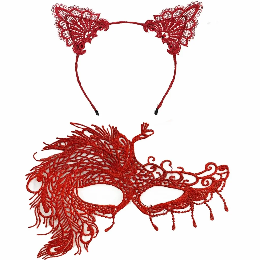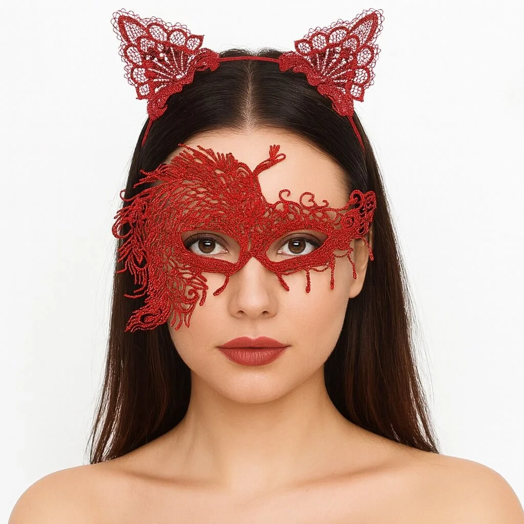 BUĞZ Alevin Zarafeti Kırmızı Dantel Maske ve Taç Seti 4 No – Kadın Kostüm Tamamlayıcı