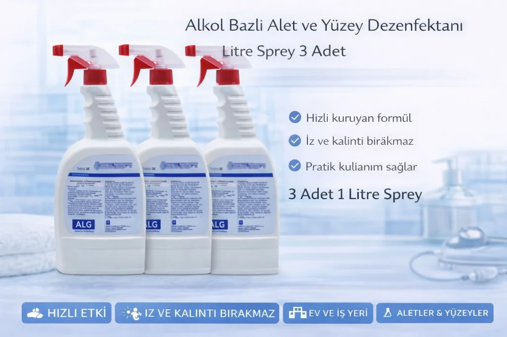 yüzey dezenfektanı, alkol bazlı dezenfektan, alet dezenfektanı, sprey dezenfektan, hijyen solüsyonu, yüzey temizleme dezenfektanı, medikal yüzey dezenfektanı, 1 litre dezenfektan, ekipman temizleyici, yüzey dezenfektanı 3 adet