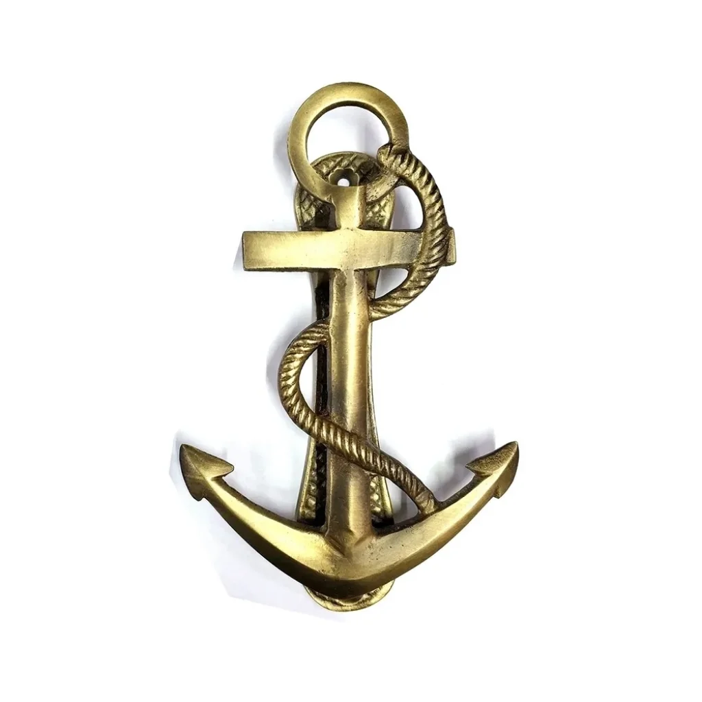 Antika Tarz Dekoratif Pirinç Halatlı, Çapa, Denizci, Gemici Kapı Tokmağı, Taktak - 170x60mm, Sarı denizcilik temalı şık ve estetik bir kapı tokmağıdır. Pirinç malzemeden üretilmiş olup, sarı renginde ve halatlı çapa motifiyle antika bir görünüm sunar. Hem işlevsel hem de dekoratif olarak kapınıza zarif bir dokunuş katar.