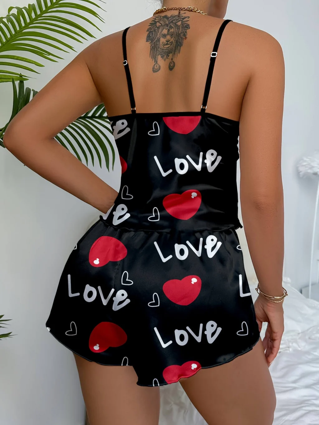 BUĞZ Aşk Temalı Kalp Desenli Siyah Saten Şortlu Gecelik Takım