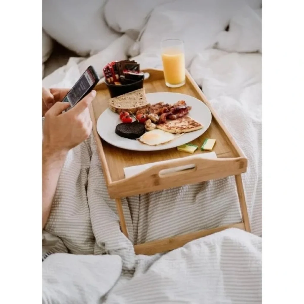 BAMBU KULPLU AYAKLI KEYİF TEPSİSİÜrün ÖzellikleriDoğal bambu malzemeden üretilen Bambu Kulplu Ayaklı Keyif Tepsisi, hem şık hem de işlevsel tasarımıyla evinizin her köşesinde pratik bir kullanım sunar. 63 cm uzunluğunda, 30 cm genişliğinde ve 25 cm yüksekliğindeki boyutlarıyla ideal bir servis alanı sağlar. Katlanabilir ayaklı yapısı sayesinde hem yatakta kahvaltı tepsisi olarak kullanılabilir hem de dizüstü bilgisayar masası olarak tercih edilebilir.Kulplu tasarımı, tepsinin kolay taşınmasını sağlar ve yan kenarları sayesinde yiyecek veya içeceklerin düşmesini engeller. Bambu yüzeyi doğal bir dokuya sahiptir, çevre dostu yapısıyla uzun ömürlü kullanım imkânı sunar. Hafif ve dayanıklı yapısı sayesinde taşınması kolaydır. Katlandığında az yer kaplar, böylece dolap veya raflarda rahatlıkla muhafaza edilebilir.Bu tepsi; kahvaltı, çay saati, çalışma alanı veya dekoratif sehpa olarak çok amaçlı kullanım için uygundur. Estetik tasarımıyla yaşam alanlarına doğal bir zarafet katar.Paket İçeriği1 adet bambu kulplu ayaklı keyif tepsisi