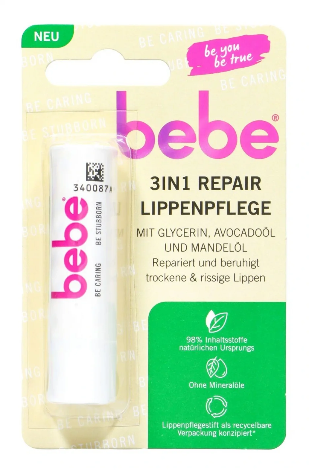 Gliserin, avokado yağı ve badem yağı içeren bebe 3'ü 1 arada onarıcı dudak bakımı, ilk uygulamadan itibaren kuru ve çatlamış dudakları onarır ve yatıştırır