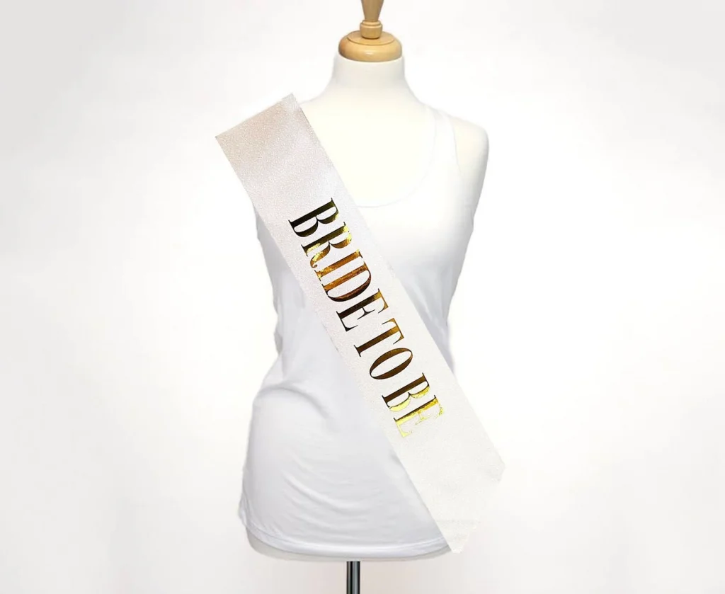 BUĞZ Beyaz Saten Üzerine Kalın Altın Yazılı Bride To Be Kuşağı 10 cm Genişlik
