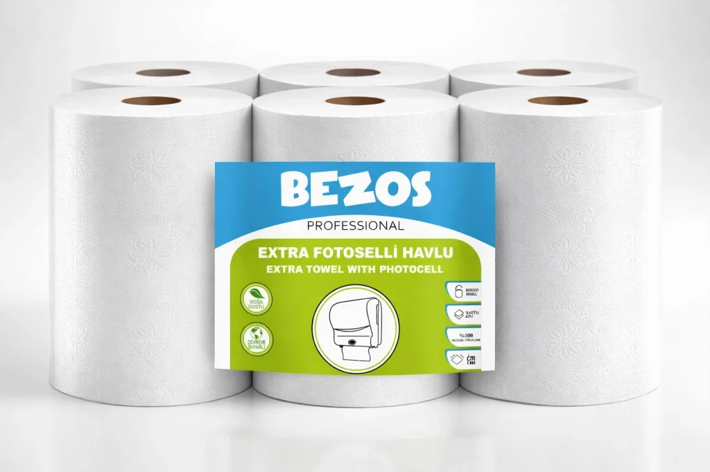 Bezos Professional Fotoselli Havlu 6 Rulo – 2 Katlı %100 Selüloz 21 cm Endüstriyel Kağıt Havlu Yoğun kullanıma uygun, hijyen standartlarını yükselten Bezos Professional Extra Fotoselli Havlu, ofisler, restoranlar, kafeler ve profesyonel mutfaklar için ideal çözümdür. Fotoselli dispenserlerle tam uyumlu yapısı sayesinde temassız kullanım sağlar, israfı azaltır ve maksimum hijyen sunar. 2 katlı güçlü dokusu, kopmadan ve dağılmadan kullanım imkânı verir. %100 selüloz içeriği ile çevreye duyarlıdır, sağlıklı ve güvenlidir. 6 rulo avantajlı koli yapısı sayesinde işletmeler için uzun süreli kullanım ve maliyet avantajı sağlar. ? Neden Bezos Professional?