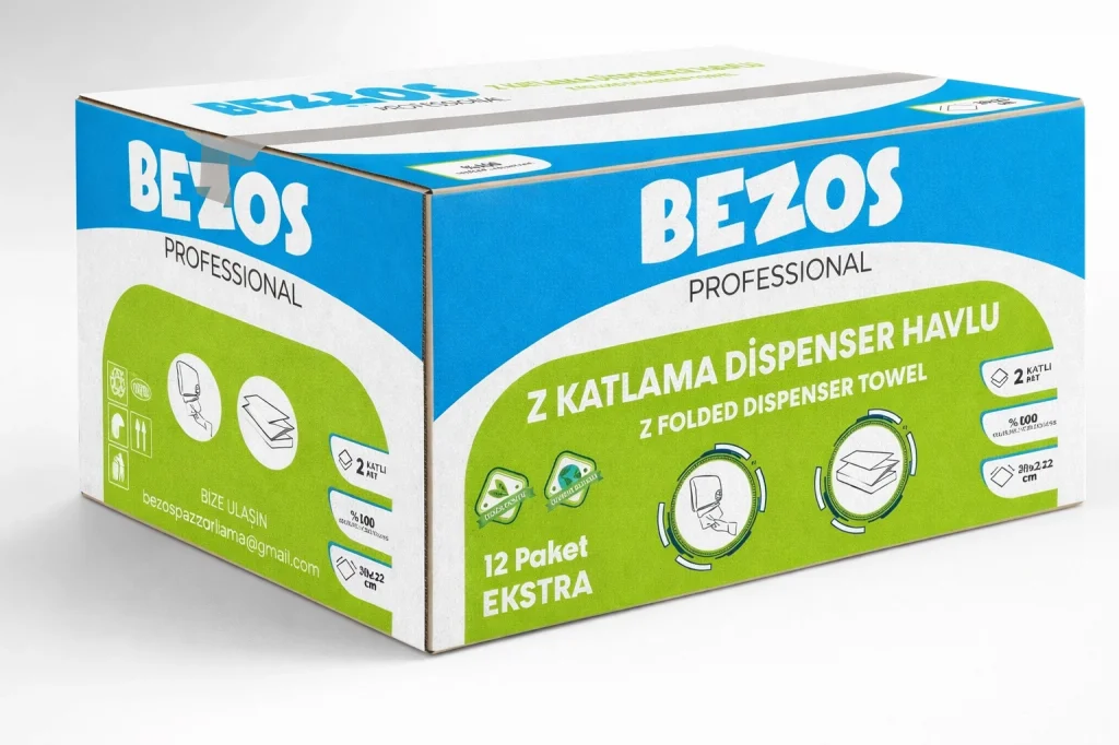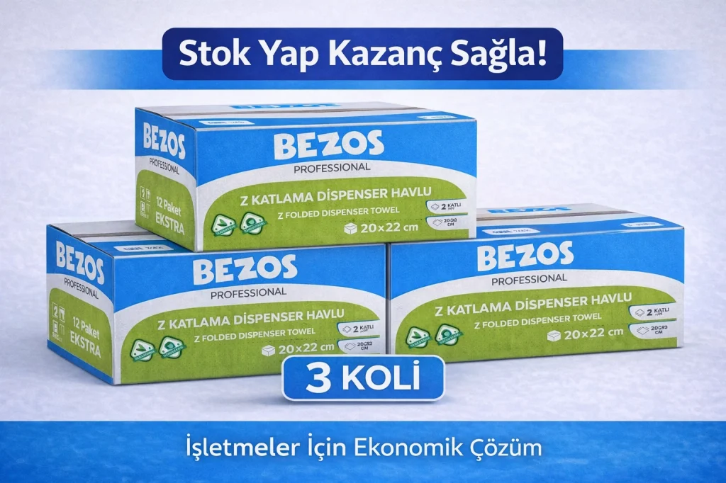Bezos Professional Z Katlamalı Dispenser Havlu 2 Katlı %100 Selüloz 20x22 cm 3 Koli (36 Paket) Bezos Professional Z Katlamalı Dispenser Havlu, yoğun kullanıma uygun yapısıyla işletmelerin hijyen ve maliyet beklentilerini aynı anda karşılamak için üretilmiştir. Z katlamalı formu sayesinde dispenser içinde düzenli durur, tek tek çekilerek kullanılır ve gereksiz tüketimi azaltır. 2 katlı %100 selüloz yapısı, yüksek emicilik sağlarken kopma yapmaz; daha az yaprakla daha etkili temizlik sunar. 3 x 12 paketlik koli içeriği, işletmeler için stok avantajı sağlar ve sürekli havlu takibi derdini ortadan kaldırır. Ofisler, restoranlar, kafeler, oteller, klinikler ve tüm ortak kullanım alanları için güvenilir ve profesyonel bir tercihtir. ??Uzun süre dayanan, düzenli tüketim sağlayan ve maliyet kontrolü sunan güçlü bir çözümdür.