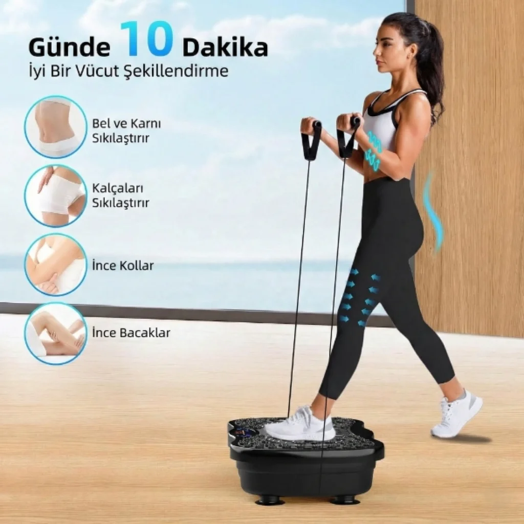 BLUETOOTH BAĞLANTILI TİTREŞİMLİ EGZERSİZ ALETİÜrün ÖzellikleriBluetooth bağlantılı titreşimli egzersiz aleti, evde kısa sürede etkili ve hedef odaklı antrenman yapmak isteyenler için geliştirilmiş ileri seviye bir titreşim platformudur. Gelişmiş çift motor teknolojisi sayesinde 120 seviyeye kadar titreşim hızı sunarak akıcı, güçlü ve dengeli bir performans sağlar; bu sayede geleneksel aerobik egzersizlere kıyasla kasları daha yoğun ve verimli şekilde çalıştırmaya yardımcı olur. Üç adet önceden ayarlanmış akıllı mod, farklı fitness hedeflerine hızlıca uyum sağlarken manuel ayarlama seçeneği ile kişisel antrenman programınızı oluşturmanıza imkân tanır. Günlük rutine kolayca eklenebilen bu cihaz, bir ay boyunca günde yalnızca 10 dakikalık kullanımda dahi gözle görülür sonuçlar elde etmeyi hedefler. Bluetooth bağlantı özelliği sayesinde müzik eşliğinde motive edici antrenman deneyimi sunar. Direnç bantları ile birlikte kullanıldığında üst vücut egzersizlerini de destekler. Farklı hız ve titreşim seviyeleri ile hem yeni başlayanlar hem de ileri seviye kullanıcılar için uygundur. Günlük spor rutini oluşturmak, kilo kontrolüne destek olmak ve vücudu şekillendirmek isteyenler için pratik ve etkili bir çözümdür. Kaymaz yüzeyi ve sağlam gövde yapısı güvenli kullanım sunarken, kompakt tasarımı ev ortamında pratik depolama avantajı sağlar. Kilo kontrolüne destek olmak, vücudu şekillendirmek ve düzenli spor alışkanlığı kazanmak isteyenler için güçlü ve modern bir egzersiz çözümüdür.Paket İçeriği1 adet Bluetooth Bağlantılı Titreşimli Egzersiz Aleti