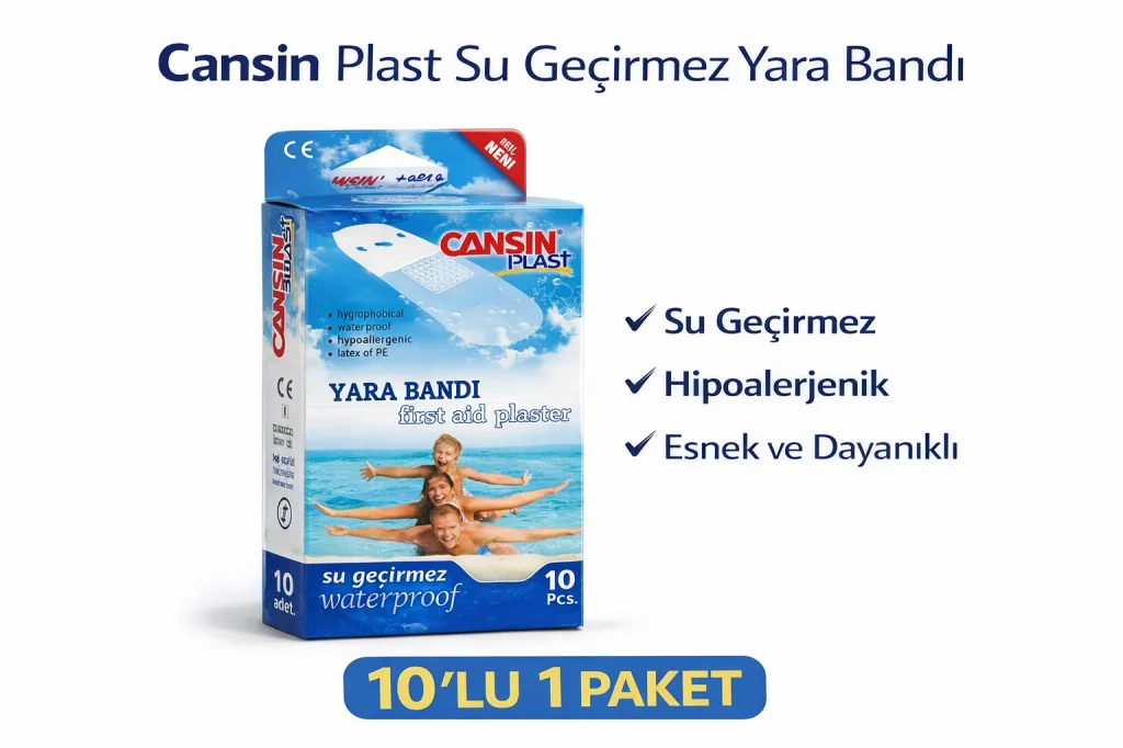 Cansın Plast Su Geçirmez Yara Bandı 10'lu 1 Paket Waterproof First Aid Plaster Cansın Plast Su Geçirmez Yara Bandı, günlük hayatta oluşabilecek küçük kesik ve sıyrıklarda güvenli koruma sağlar. Waterproof özelliği sayesinde suya dayanıklıdır ve duş, el yıkama veya deniz gibi temaslarda yaranın korunmasına yardımcı olur. Her bir paketin içerisinde 10 adet yara bandı bulunmaktadır. Ürün 1 paket ve 24 paket varyasyon seçenekleri ile sunulmaktadır. 24 paket seçeneği özellikle eczane, market, medikal satış noktaları ve toplu alımlar için idealdir. Öne Çıkan Özellikler: