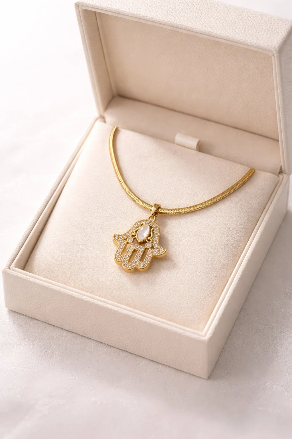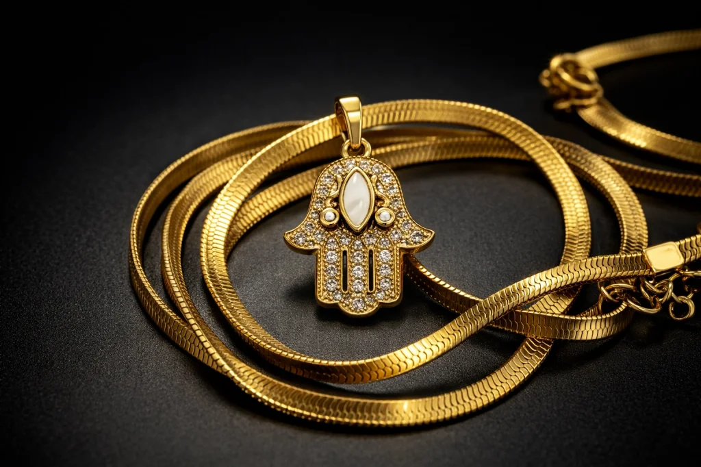 Çelik Hamsa Fatma Eli Kolye – Taşlı Altın Renk İtalyan Zincir Kadın Kolye Zarif tasarımı ve anlam yüklü sembolüyle öne çıkan Hamsa (Fatma Eli) kolye, modern şıklığı klasik detaylarla buluşturur. Altın renk yılan zinciri ve taşlı el figürü sayesinde günlük kullanımdan özel gün kombinlerine kadar her stile kolayca uyum sağlar. Paslanmaz çelikten üretilen bu kolye, kararma yapmaz ve uzun süreli kullanıma uygundur. Taş detayları ışığı estetik şekilde yansıtarak kolyeye premium bir görünüm kazandırır. Minimal ama dikkat çekici yapısı sayesinde hem kendiniz hem de sevdikleriniz için ideal bir hediye seçeneğidir. Öne Çıkan Özellikler: