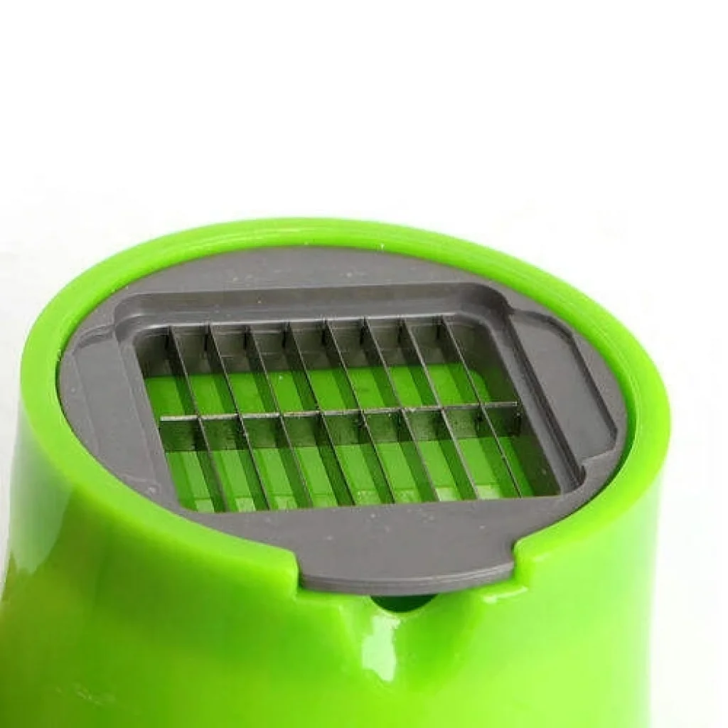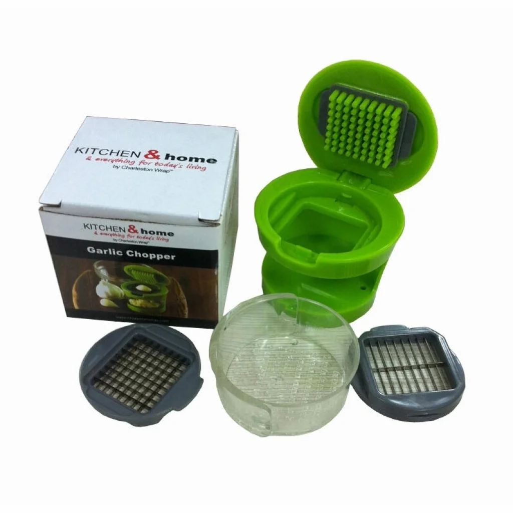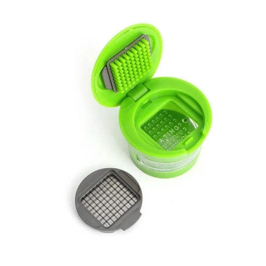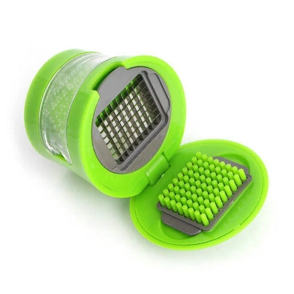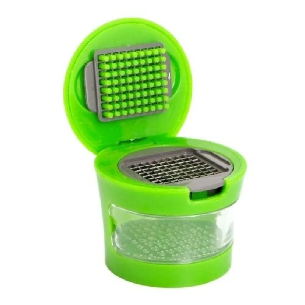 Kapaklı baskı mekanizması, tek elle güvenli kullanım sunar. Üst kapakta yer alan itici pimler sayesinde sarımsak veya soğan doğrudan bıçak yüzeyine yönlendirilir; böylece kayma, sıçrama veya düzensiz kesim oluşmaz. Alt bölümde yer alan paslanmaz çelik bıçak ızgarası, gıdayı tek hamlede aşağıya iletir.