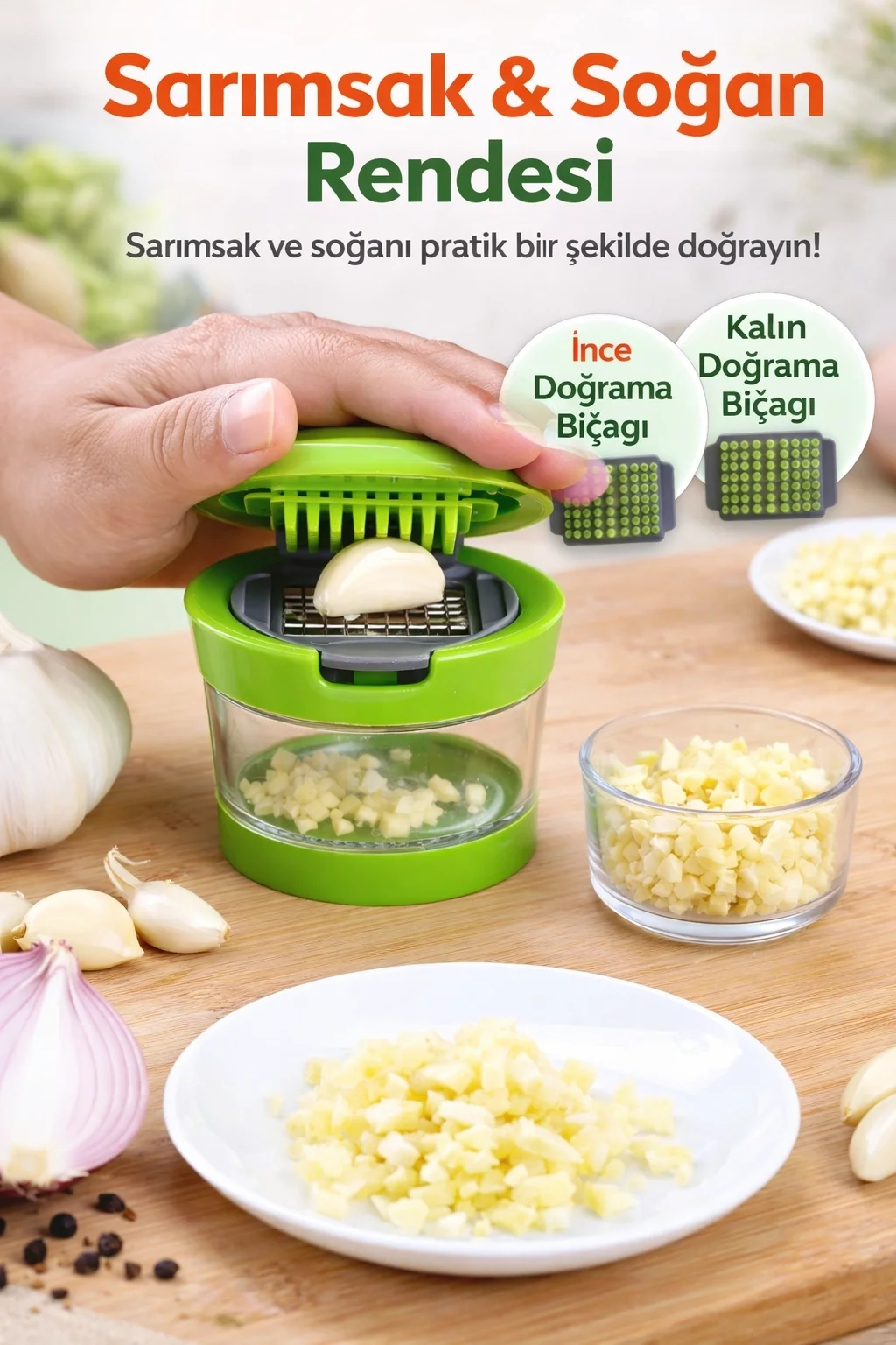 Günlük mutfak hazırlıklarında hız, hijyen ve kontrol arayanlar için tasarlanan Çıkarılabilir Hazneli Kapaklı Sarımsak & Soğan Doğrayıcı, manuel kullanımın pratikliğini profesyonel sonuçlarla birleştirir. Ürün, özellikle sarımsak ve soğan gibi yoğun aromalı gıdaların eşit, kontrollü ve dağılmadan doğranmasını sağlar.