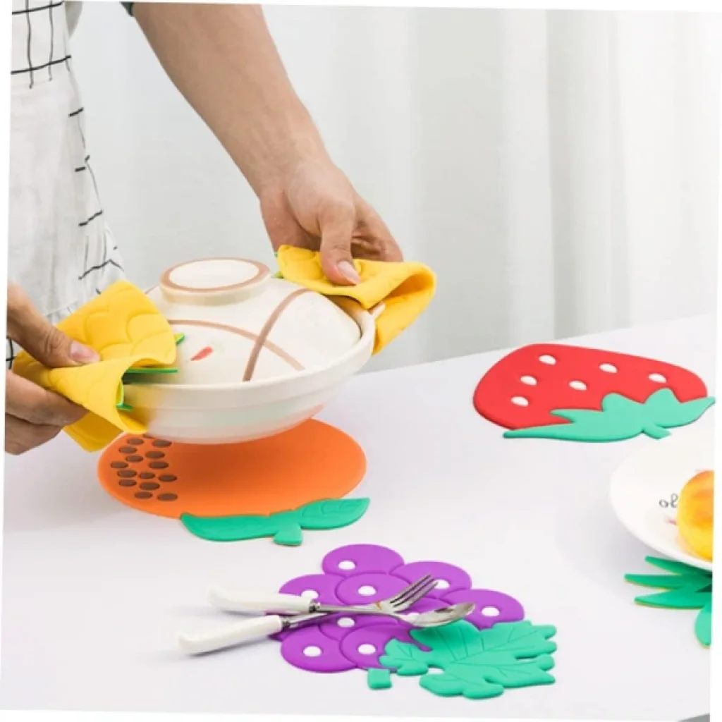 ÇOK AMAÇLI SİLİKON ISIYA DAYANIKLI ALTLIKÜrün ÖzellikleriYüksek kaliteli, BPA içermeyen silikon 200°C'ye kadar ısıya dayanıklıdır, sıcak tencere, tava ve çaydanlıklar için güvenle kullanılabilir. Yüzeye sıkıca tutunur, kaymayı ve kazaları önler. Su ve sabunla kolayca temizlenebilir, bulaşık makinesinde yıkanabilir.Çilek, yaprak, üzüm gibi eğlenceli şekil ve renk seçenekleri sunar. Sıcak tencere, tava ve çaydanlıkların masada ya da tezgahta kullanılmasını güvenli hale getirir. Bardak altlığı olarak kullanılarak masanın korunmasını sağlar.Dekoratif tasarımıyla mutfaklara eğlenceli bir hava katar. Hem koruyucu hem dekoratif olarak kullanılabilir. Tekrar kullanılabilir ve dayanıklı yapısıyla çevre dostudur. Eğlenceli tasarımları sayesinde sofralara renk katar.Bu ürün, özellikle mutfakta hem estetik hem de işlevsel çözümler arayan kullanıcılar için idealdir. Şık tasarımı ve dayanıklı yapısıyla mutfaklar için vazgeçilmez bir yardımcıdır.Paket İçeriği1 adet Silikon Isıya Dayanıklı Altlık