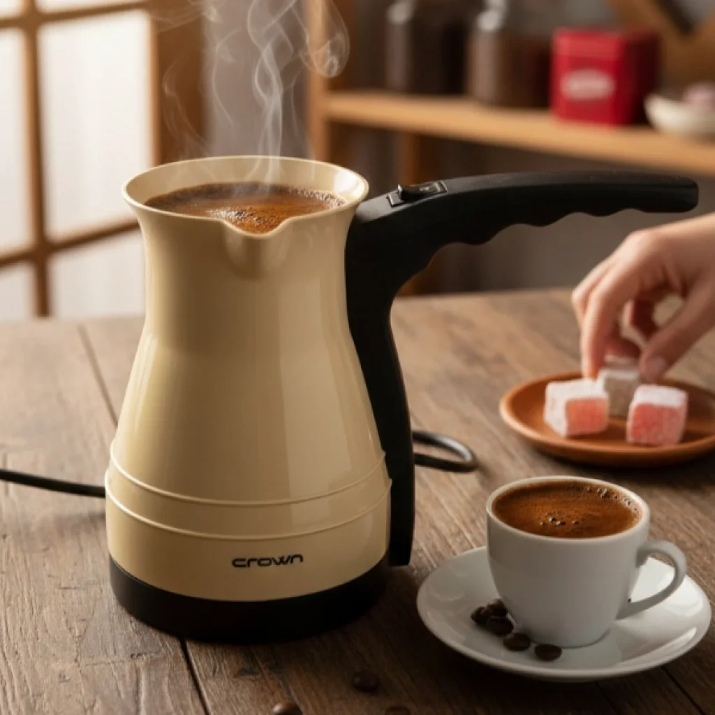 CROWN ELEKTRİKLİ CEZVE KAHVE MAKİNESİ Ürün ÖzellikleriPratik ve hızlı kahve hazırlamak isteyenler için tasarlanan Crown Elektrikli Cezve Kahve Makinesi, güçlü 1000W motor gücü sayesinde kısa sürede kahvenizi hazır hale getirir. Günlük kullanım için ideal olan bu elektrikli cezve, klasik Türk kahvesi lezzetini zahmetsiz şekilde hazırlamanıza yardımcı olur. Dayanıklı plastik gövdesi hafif yapısıyla kolay taşınır ve ergonomik sap tasarımı güvenli tutuş sağlar. Üzerinde bulunan açma kapama düğmesi ile kullanım kontrolü sağlanır. Kompakt tasarımı sayesinde mutfakta fazla yer kaplamaz ve hem ev hem ofis ortamında rahatlıkla kullanılabilir. Pratik yapısı ile su ısıtma ve kahve hazırlama işlemlerinde kullanıma uygun olan plastik cezve kahve makinesi, hızlı ve konforlu bir deneyim sunar.Ürün Teknik Özellikleri Özellik Açıklama Ürün Adı Crown Elektrikli Cezve Kahve Makinesi Güç 1000W Malzeme Plastik gövde Kullanım Türk kahvesi ve sıcak içecek hazırlama Kontrol Açma / Kapama düğmeli Paket İçeriği1 adet Crown Elektrikli Cezve Kahve Makinesi