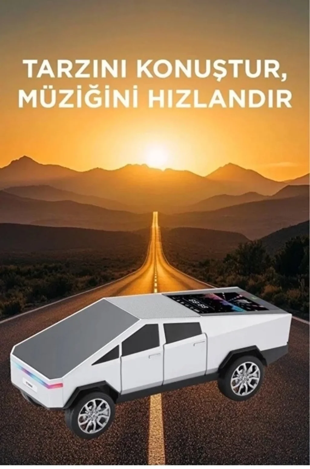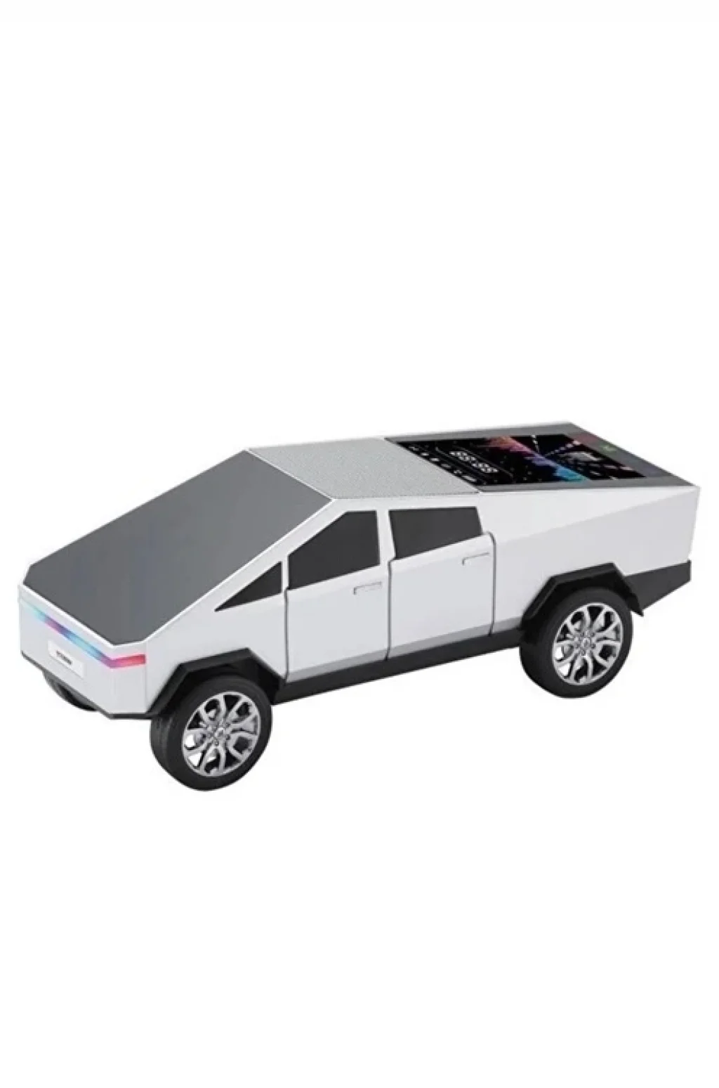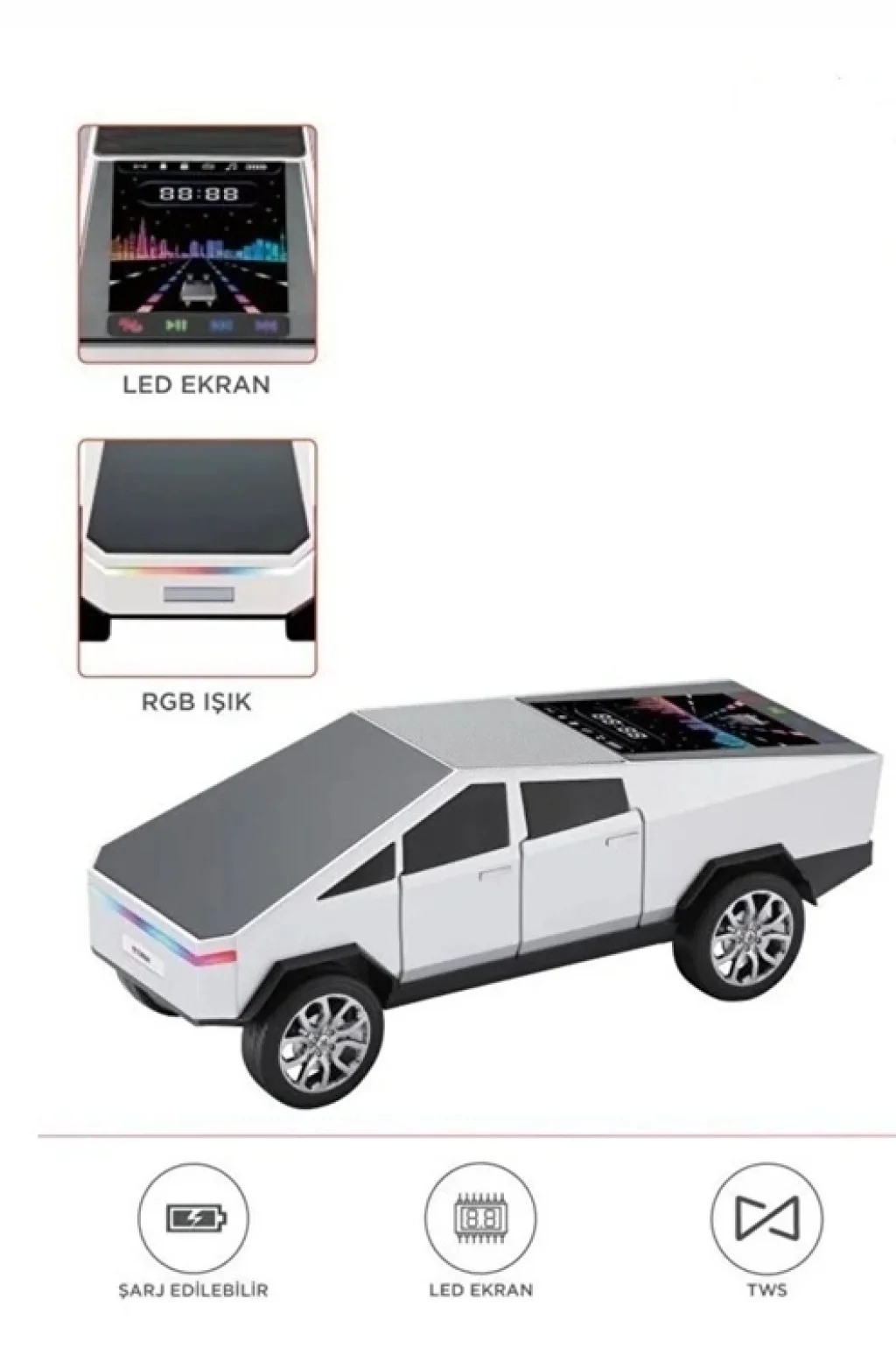 Araba Tasarımlı Bluetooth Hoparlör 15W Güçlü Ses RGB LED /TWS/USB kablosuz hoparlör ile müziğinizi yollara taşıyın Modern CyberTruck esintili tasarımıyla dikkat çeken bu hoparlör, sadece bir ses cihazı değil, aynı zamanda şık bir aksesuar.