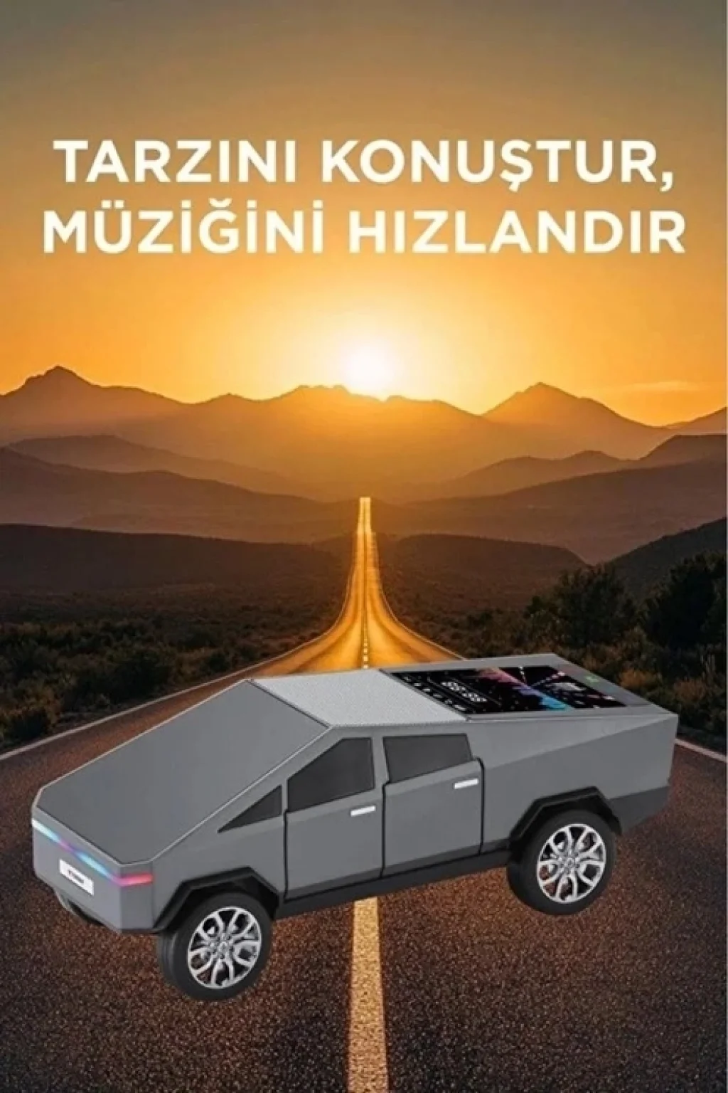 Araba Tasarımlı Bluetooth Hoparlör 15W Güçlü Ses RGB LED /TWS/USB kablosuz hoparlör ile müziğinizi yollara taşıyın Modern CyberTruck esintili tasarımıyla dikkat çeken bu hoparlör, sadece bir ses cihazı değil, aynı zamanda şık bir aksesuar.