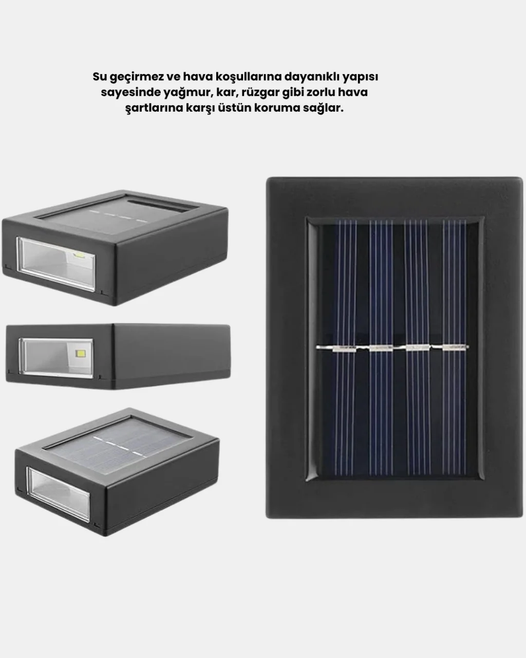 Bu dayanıklı solar aplik, dış mekan ışıklandırmasını hem ekonomik hem de uzun ömürlü hale getiren modern bir aydınlatma çözümüdür. Su geçirmez gövde yapısı sayesinde yağmur, kar, dolu, rüzgâr ve nemli hava koşullarında bile tam performansla çalışır. Sert dış etkenlere karşı geliştirilmiş dayanıklı malzemesi, ürünü uzun yıllar boyunca sorunsuz bir şekilde kullanabilmenizi sağlar. Bahçeler, balkonlar, teraslar, duvar kenarları ve dış cepheler için ideal bir kullanım sunar.LED teknolojisi sayesinde hem düşük enerji tüketimi sağlar hem de güçlü bir ışık performansı ortaya koyar. Güneş paneli gün boyunca ışığı depolayarak bataryayı şarj eder; akşam olduğunda ise LED ışık otomatik olarak devreye girer. Klasik elektrikli aydınlatmalara göre çok daha az bakım gerektiren bu ürün, çevre dostu yapısıyla da dikkat çeker. Elektrik gerektirmediği için dış mekân aydınlatmasında bütçe dostu bir alternatiftir.Kablo gerektirmeyen montajı, kullanıcıya büyük kolaylık sunar. Duvara, çit kenarına veya istediğiniz herhangi bir dış yüzeye kolayca monte edebilirsiniz. Otomatik açılma-kapanma sensörü sayesinde ürünü manuel olarak kontrol etmenize gerek kalmaz. Gündüz şarj olur, gece kendiliğinden yanar ve gün ağardığında kapanır.Modern tasarımı dış mekanlara estetik bir dokunuş katarken, güçlü LED ışığı geniş bir alanı aydınlatır. Bahçede güvenliği artırmak, yürüyüş yollarını aydınlatmak veya dekoratif bir ambiyans oluşturmak için idealdir. Düşük maliyetli, uzun ömürlü ve dayanıklı solar aydınlatma arayan herkes için kusursuz bir seçenektir.