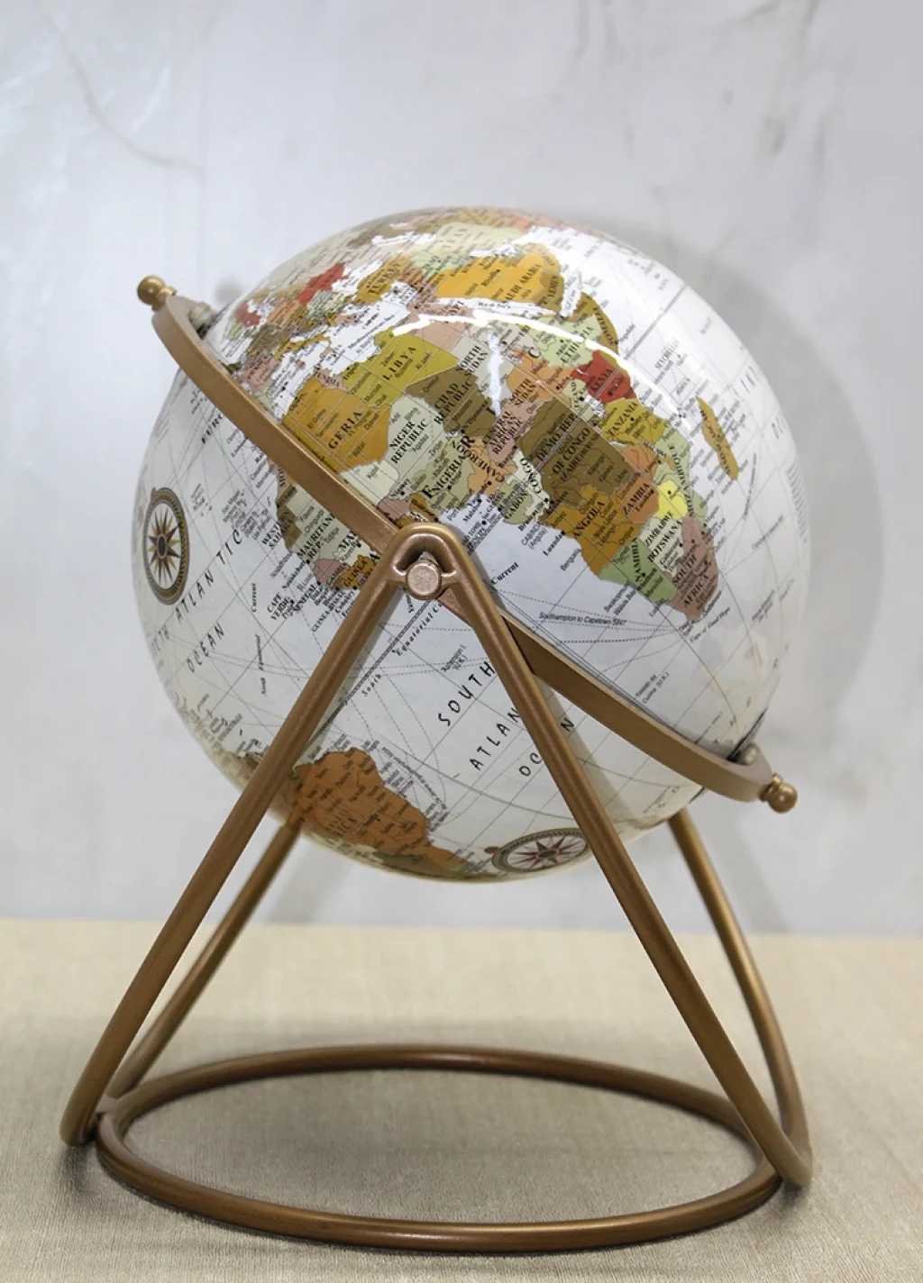 DEKORATİF METAL STANDLI DÜNYA KÜRE - MODEL 4Ürün ÖzellikleriDekoratif Metal Standlı Dünya Küre - Model 4, açık krem ve altın tonlarının hâkim olduğu zarif atlas tasarımı ile modern geometrik metal standı bir araya getirerek güçlü ve şık bir dekoratif görünüm sunar. 30x27 cm ölçüsü sayesinde masa üzerinde dengeli ve dikkat çekici bir hacim oluşturur. Açık zeminli harita yüzeyi, kıta detaylarını yumuşak renk geçişleriyle öne çıkarırken altın renkli üçgen form metal stand tasarımı ürüne çağdaş ve mimari bir karakter kazandırır Metal standlı dekoratif dünya küre arayan kullanıcılar için hem klasik hem modern dekorasyon anlayışına uyum sağlayan estetik bir alternatiftir. Ofis masası, çalışma odası, salon konsolu veya kitaplık üzerinde prestijli bir odak noktası oluşturur. Sağlam metal stand sistemi sayesinde dengeli durur ve uzun süreli dekoratif kullanım için uygundur. Modern atlas dünya küresi, bulunduğu ortama entelektüel ve sofistike bir atmosfer kazandırır.Ürün Teknik ÖzellikleriÖzellikAçıklamaÜrün AdıDekoratif Metal Standlı Dünya Küre - Model 4Boyut30 x 27 cmStand TürüAltın Renkli Metal Geometrik StandTasarımAçık Krem AtlasKullanım AlanıEv, Ofis, Salon, Çalışma AlanıPaket İçeriği1 Adet Dekoratif Metal Standlı Dünya Küre - Model 4