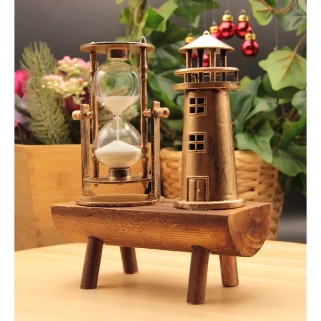 DENİZ FENERİ BİBLOLU KUM SAATİÜrün ÖzellikleriDeniz feneri biblolu kum saati, deniz temalı nostaljik tasarımıyla dikkat çeken dekoratif bir masa süsüdür. Metalik altın renkteki deniz feneri detayı ve şeffaf cam kum saati, ahşap görünümlü platform üzerinde bir araya getirilerek estetik bir bütünlük oluşturur. Üzerindeki “Love” yazısı ürüne romantik bir dokunuş katarken, retro görünümü sayesinde her ortamda şık bir atmosfer yaratır. Ofis, ev veya hediye alternatifi olarak değerlendirilebilir. El işçiliği hissi veren yüzeyi ve zarif detayları ile koleksiyonluk bir parçadır.Paket İçeriği1 Adet Deniz Feneri Biblolu Kum Saati