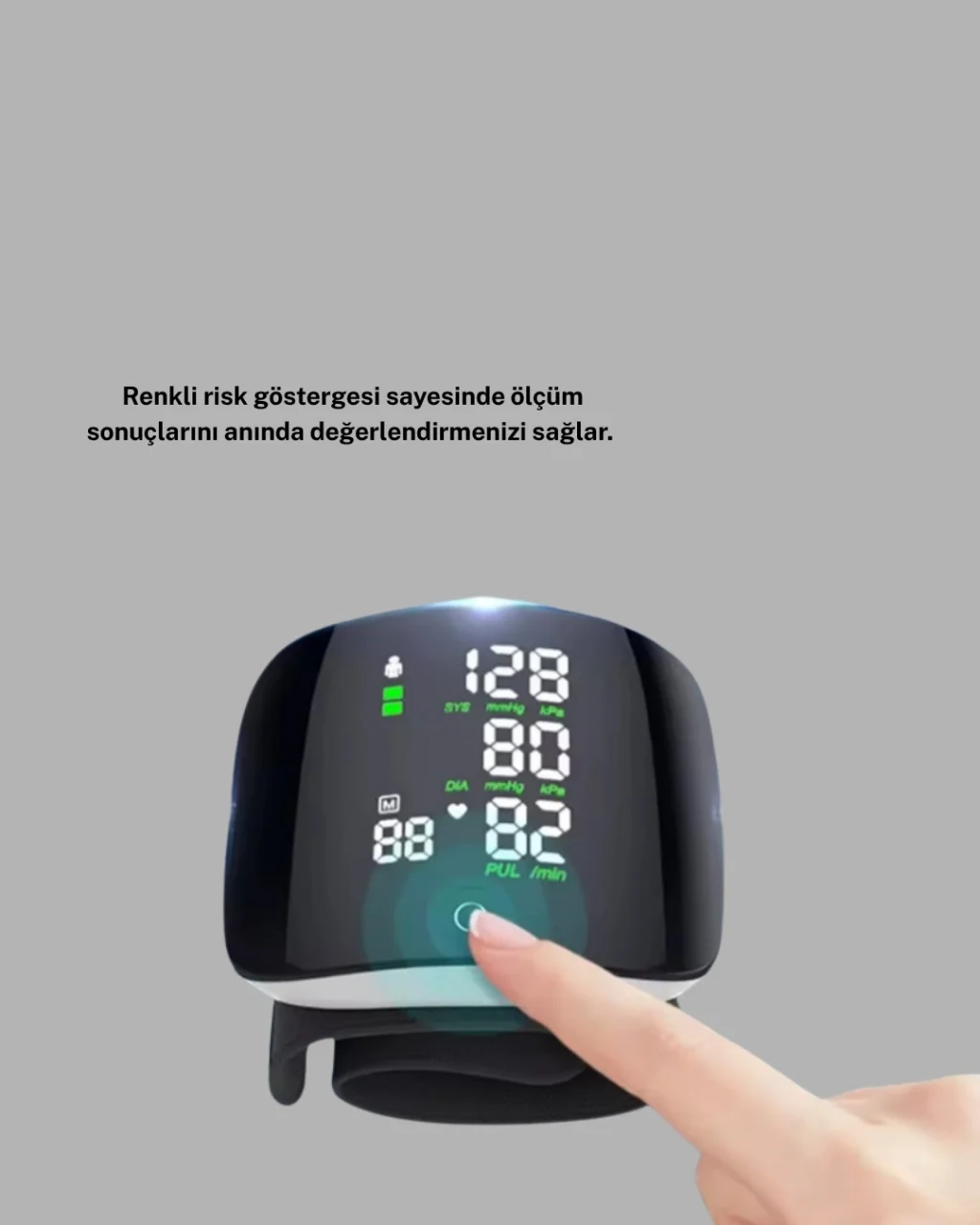 Sağlığınızı düzenli olarak takip etmek istiyorsanız, bu dijital bilek tansiyon aleti tam size göre!Hassas ölçüm teknolojisiyle kısa sürede doğru sonuçlar alabilir, tansiyonunuzu anlık olarak kontrol altında tutabilirsiniz.Çift kullanıcı hafıza sistemi, iki kişinin cihazı ortaklaşa kullanmasına olanak tanır.Her kullanıcı için 60 ölçüm kaydı saklanabilir, bu sayede zaman içindeki tansiyon değişimlerinizi kolayca izleyebilirsiniz.Cihaz, ölçüm sırasında aritmi tespiti yaparak kalp ritminde düzensizlik varsa kullanıcıyı uyarır.Geniş ve okunaklı siyah ekranı, sayısal değerleri net bir şekilde gösterir.Renkli risk göstergesi, ölçüm sonucunun normal, yüksek ya da düşük olup olmadığını anında belirtir.13,5 – 21,5 cm bilek ölçülerine uygun tasarımı sayesinde hemen herkes tarafından kullanılabilir.Otomatik kapanma özelliği, enerji tasarrufu sağlar; taşınabilir yapısı sayesinde seyahatlerde bile kolayca yanınızda taşıyabilirsiniz.Evde, işte veya yolculukta, bu kompakt cihaz sayesinde tansiyonunuzu her an kontrol edebilirsiniz.Güvenilir sonuçlar ve kullanım kolaylığı ile profesyonel ölçüm kalitesini evinize taşır.
