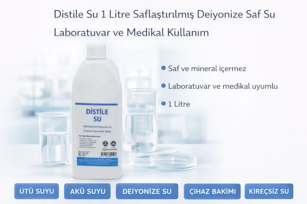 distile su, saf su 1 litre, deiyonize su, ütü suyu, akü suyu, saflaştırılmış su, laboratuvar suyu, medikal saf su, cihaz bakım suyu, kireçsiz su