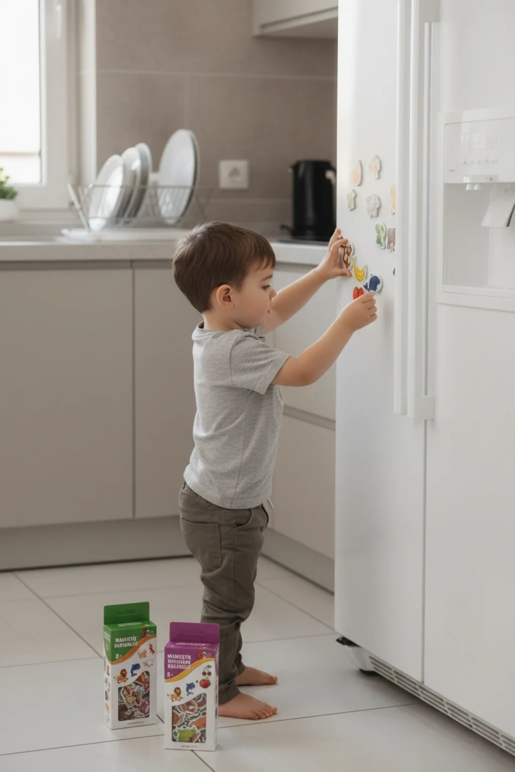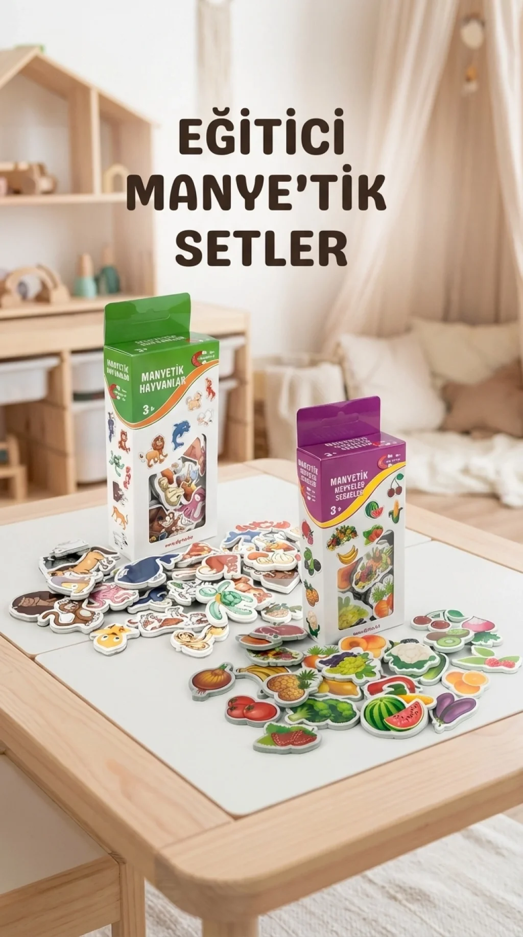 Bu eğitici set, çocukların hayvanlar ve sebze-meyveler hakkında bilgi edinmesini sağlar. Mıknatıslı yapısı sayesinde buzdolabına ve metal yüzeylere kolayca yapışabilir. Çocukların eğlenerek öğrenmesine yardımcı olurken el-göz koordinasyonunu geliştirir.