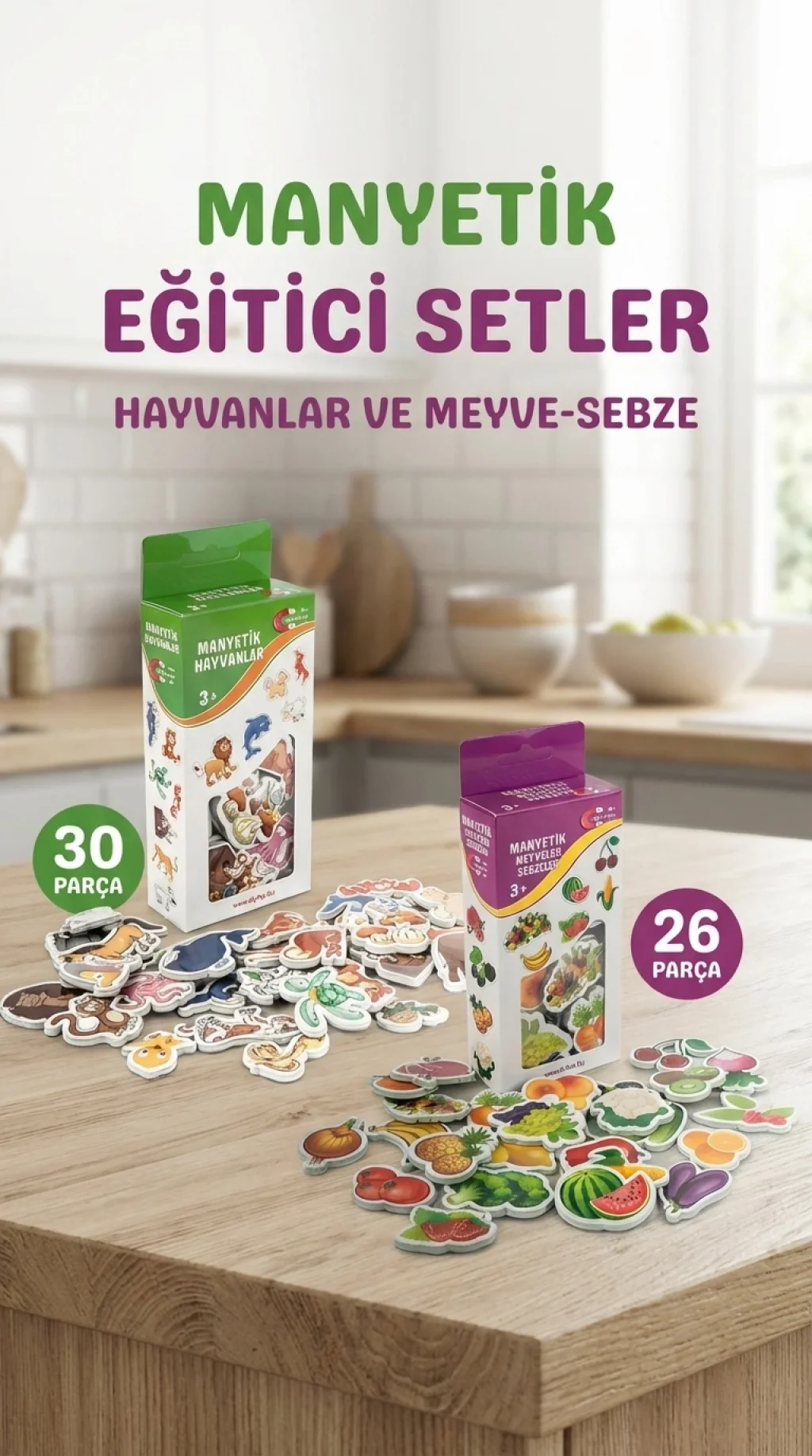 Çocukların eğlenceli vakit geçirmesi ve öğrenmesi amacıyla tasarlanmış 30 hayvan ve 26 sebze-meyveden oluşan mıknatıslı set. Bu set buzdolabına kolayca yapışır, çocukların motor becerilerini geliştirmeye yardımcı olur.