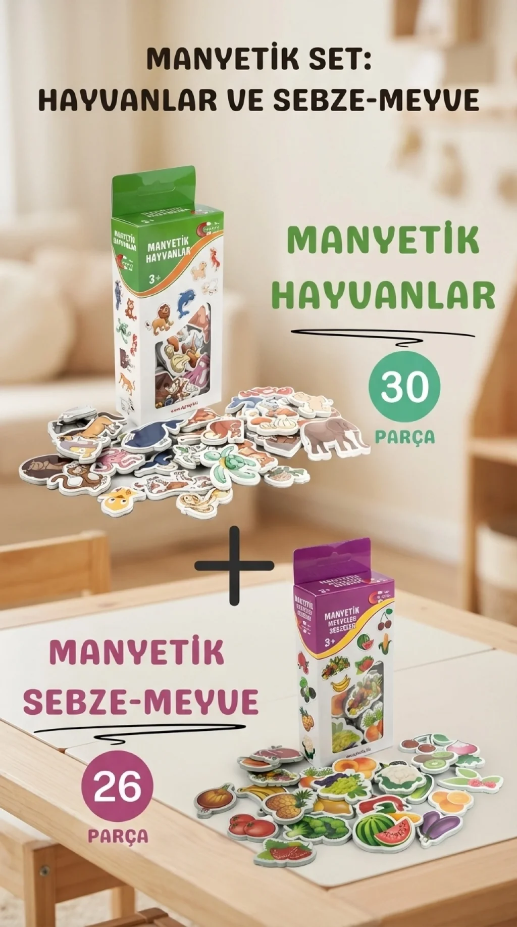Manyetik yapısıyla bu eğitici oyuncak seti, çocuklara hayvanlar ile sebze ve meyveleri tanıma imkanı sunar. 30 hayvan figürü ve 26 sebze-meyve parçasından oluşan set, buzdolabına veya metal yüzeylere kolayca yapışır. Çocukların el-göz koordinasyonunu geliştirirken, eğlenceli bir öğrenme deneyimi sağlar.