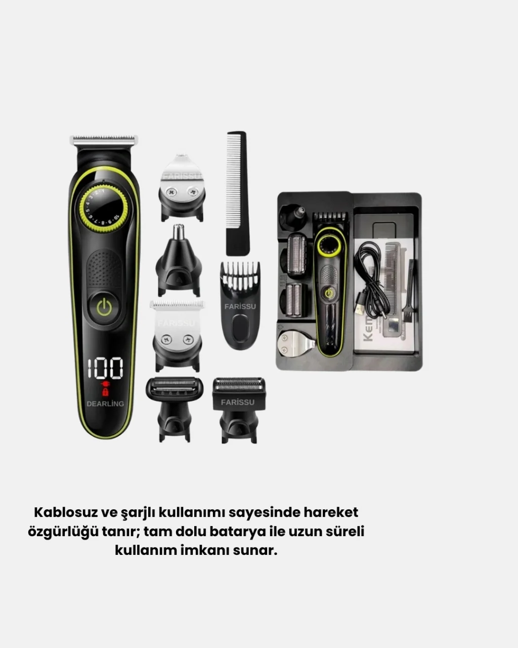 Kendine özen gösteren erkekler için özel olarak tasarlanmış bu 5’i 1 Arada Erkek Bakım Seti, tek cihazda beş farklı işlemi gerçekleştirerek zamandan tasarruf sağlar.Saç kesimi, sakal düzeltme, burun ve kulak tıraşı, vücut bakımı ve şekillendirme işlemlerinde profesyonel performans sunar.Paslanmaz çelik bıçakları, keskinliğini uzun süre korur ve cilt dostu yapısı sayesinde tahrişi önler.Güçlü motoru, tıraş süresini kısaltırken pürüzsüz sonuçlar sağlar.Kablosuz tasarımı ve uzun ömürlü bataryası, tam dolu şarjla uzun süreli kullanım imkanı sunar.Ayarlanabilir başlıkları, kişisel bakımınızı istediğiniz uzunlukta yapabilmenizi sağlar.LED göstergesi ile şarj durumunu kolayca kontrol edebilir, sessiz çalışma teknolojisi sayesinde konforlu bir deneyim yaşayabilirsiniz.Suya dayanıklı bıçakları ve çıkarılabilir parçaları sayesinde temizliği kolaydır.Bu çok yönlü bakım seti, günlük rutininizi profesyonel bir tıraş deneyimine dönüştürür.