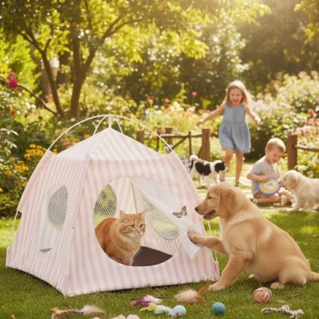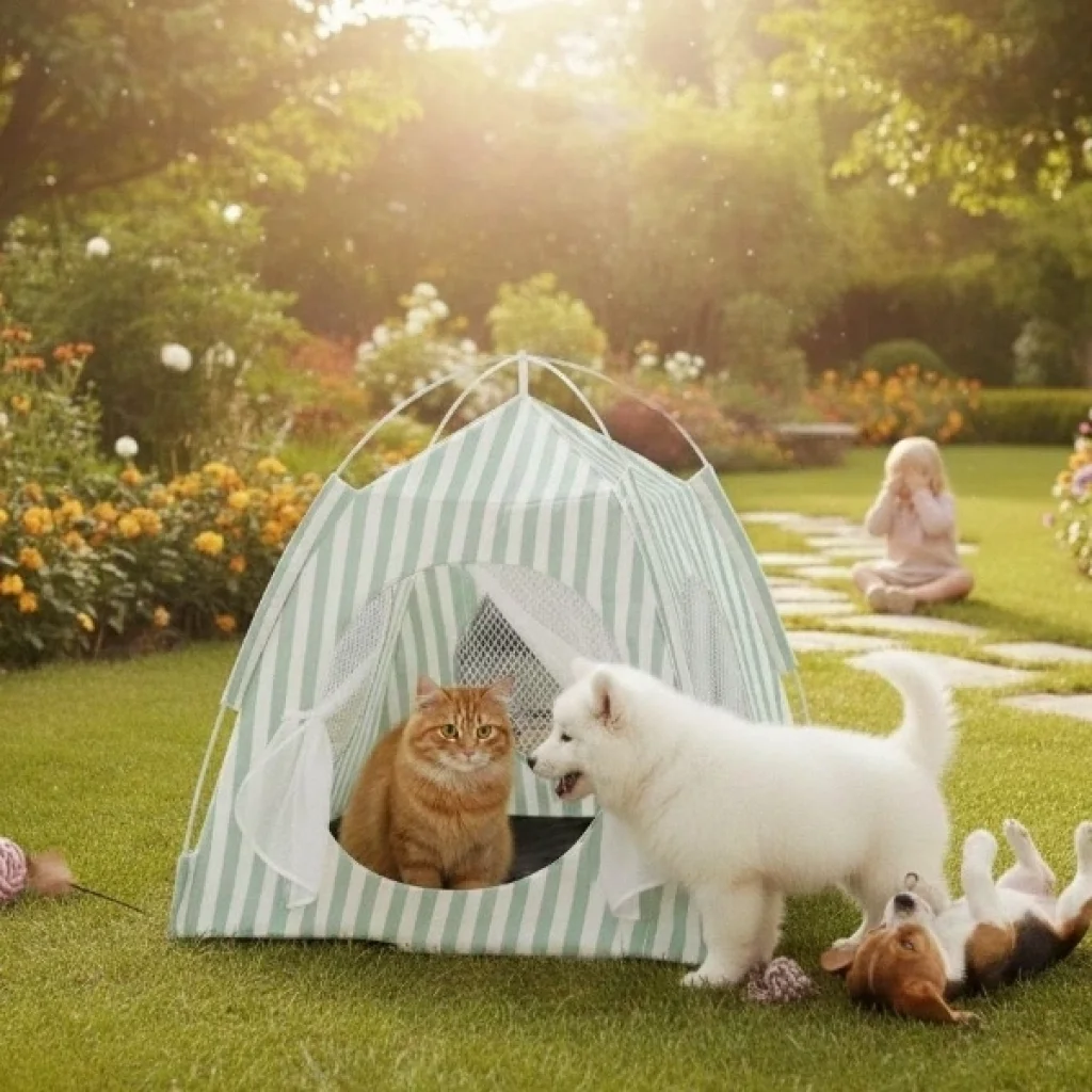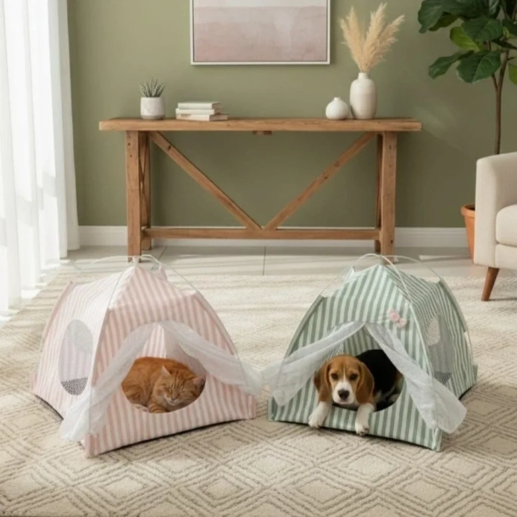 EVCİL HAYVAN KATLANABİLİR OYUN ÇADIRIÜrün ÖzellikleriEvcil Hayvan Katlanabilir Oyun Çadırı, kediler ve küçük ırk köpekler için güvenli ve eğlenceli bir yaşam alanı sunar. 41x41 cm taban ölçüsü ve 43 cm yüksekliği ile evcil hayvanların rahatça içine girip uzanabileceği bir alan oluşturur. Hafif ve katlanabilir yapısı sayesinde hem ev içinde hem de dış mekânda kolayca kullanılabilir. Nefes alabilir file pencereleri hava sirkülasyonunu artırırken, ön kısmındaki perde detaylı giriş kapısı hayvanların özgürce girip çıkmasını sağlar. Dayanıklı kumaşı uzun süreli kullanım sağlar ve pratik kurulumu ile her ortamda hızlıca hazırlanabilir. Renk seçimi yapılamaz; görselde yer alan renklerden biri olarak gönderilir.Paket İçeriği1 adet Katlanabilir Evcil Hayvan Oyun Çadırı