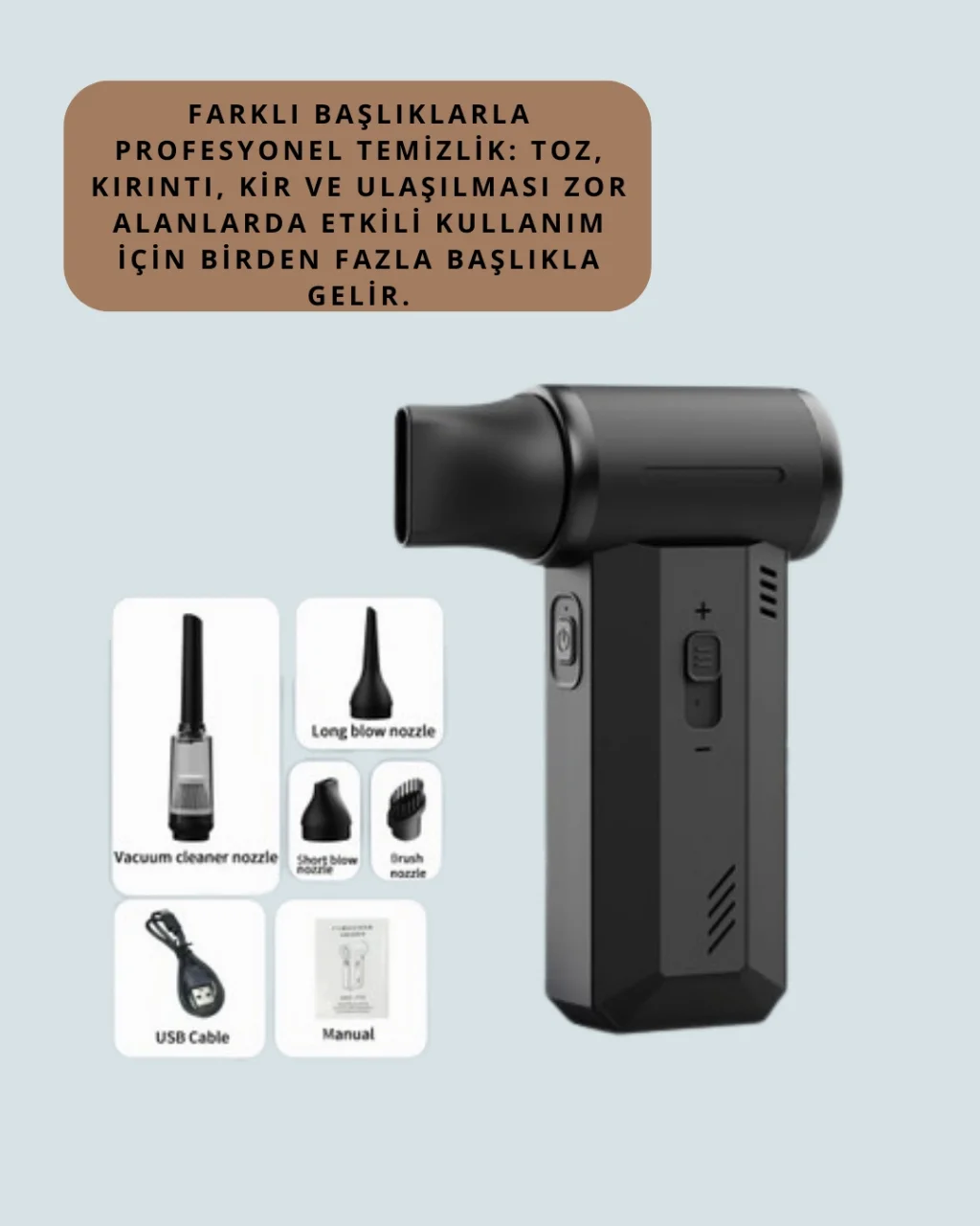 Kompakt boyutları ve güçlü motoru ile bu hava üfleme ve vakum cihazı, farklı alanlarda çok yönlü kullanım sunar. Elektronik cihazlardan araç iç temizliğine kadar birçok yerde kullanılabilir. Şarjlı bataryası sayesinde kablo derdi olmadan pratik kullanım sağlar. Type-C giriş desteği ile hızlı ve kolay şarj edilir. Üç kademe hız seçeneğiyle her ihtiyaca uygun çalışma modu bulunur. Zengin kutu içeriği ile farklı başlık seçenekleri sunar. Dayanıklı gövdesi darbelere ve yüksek ısıya karşı dirençlidir. Hem temizlik hem de serinletme işlevi ile günlük hayatın vazgeçilmez ürünlerinden biridir.Ürün Markası: Lisinya