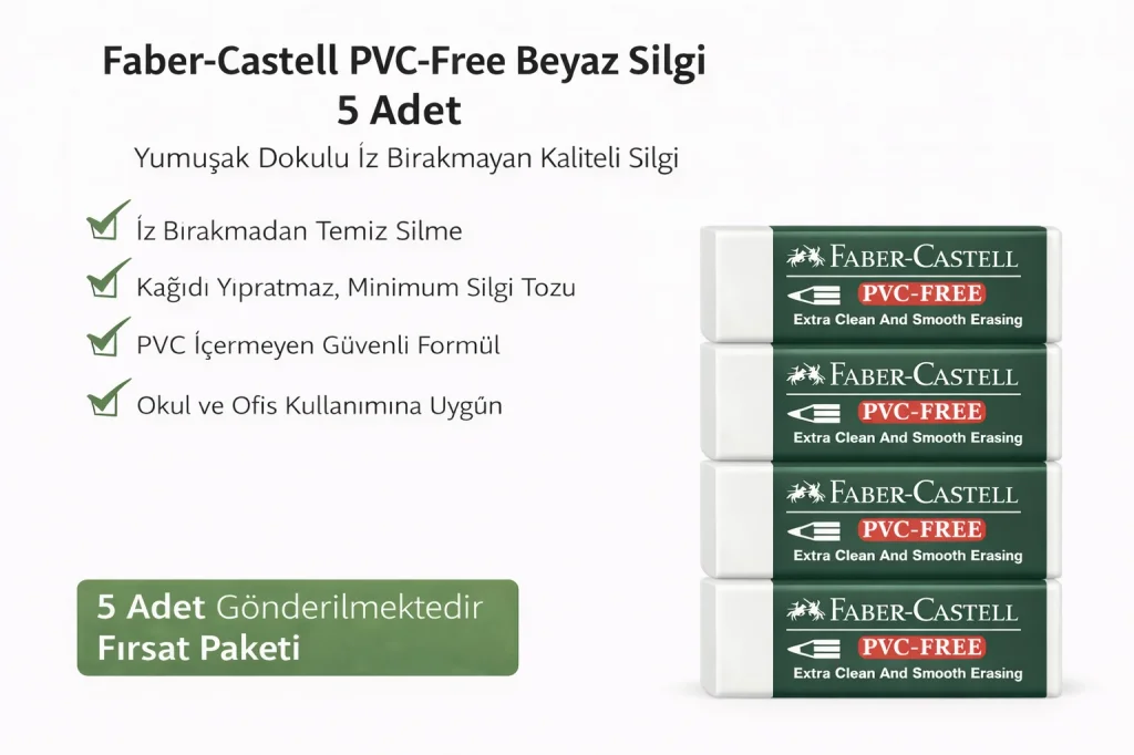 faber castell silgi, faber castell pvc free silgi, beyaz silgi 5 adet, iz bırakmayan silgi, okul silgisi, ofis silgisi, kaliteli silgi, toplu silgi seti, pvc içermeyen silgi, yumuşak silgi, kırtasiye ürünleri, silgi fiyatları, faber castell 5 li silgi