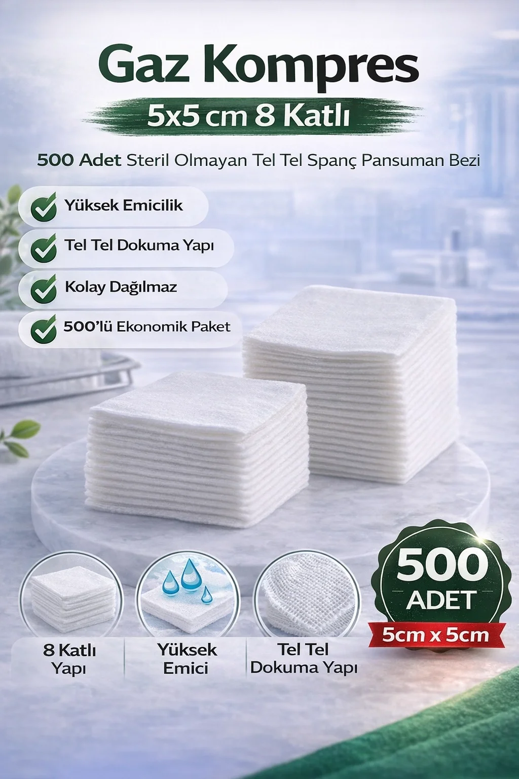 Gaz Kompres 5x5 cm 8 Katlı 500 Adet Steril Olmayan Tel Tel Spanç Pansuman Bezi Gaz kompres tel tel spanç, yüksek emiciliğe sahip pamuk ipliğinden üretilmiş olup medikal pansuman ve temizlik işlemleri için ideal bir üründür. 5x5 cm ölçüsü ve 8 katlı kalın yapısı sayesinde sıvıyı hızlı şekilde emer ve etkili temizlik sağlar. Steril olmayan yapısı sayesinde yara temizliği, enjeksiyon öncesi cilt hazırlığı, pansuman uygulamaları ve genel hijyen işlemlerinde güvenle kullanılabilir. Tel tel dokuma yapısı sayesinde dayanıklıdır, kolay dağılmaz ve hassas bölgelerde güvenli kullanım sunar. 500 adet ekonomik paket içeriği sayesinde hastaneler, klinikler, sağlık kabinleri, diş hekimleri, veteriner uygulamaları ve evde bakım için uzun süreli kullanım avantajı sağlar.