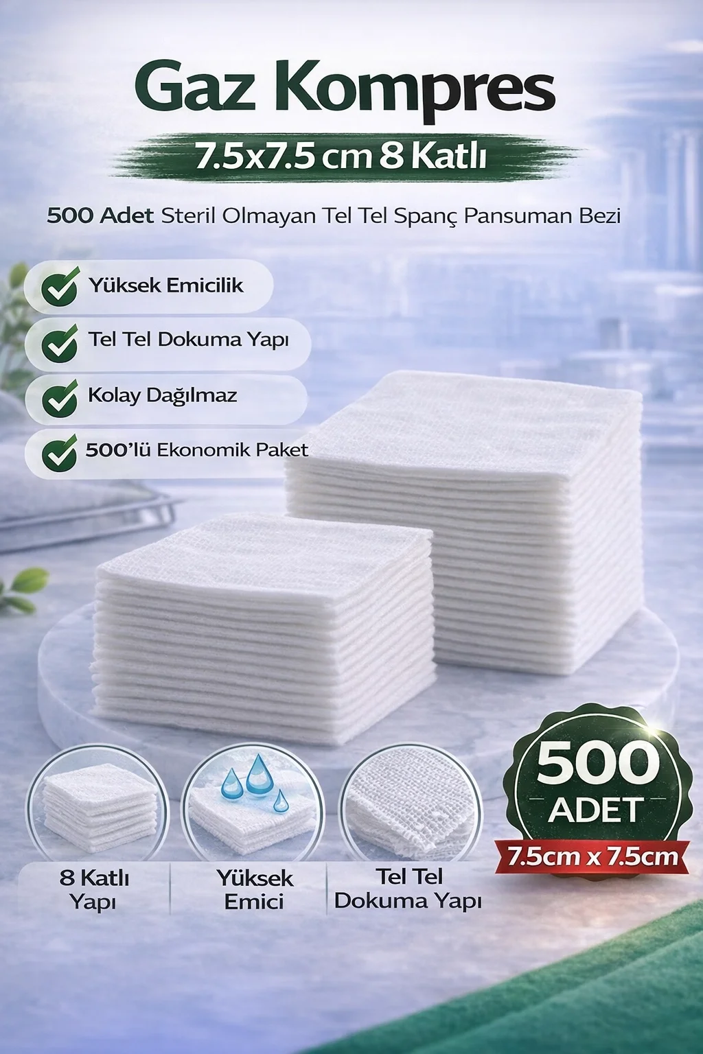 Ürün Açıklaması (SEO Uyumlu): Gaz kompres tel tel spanç, yüksek emiciliğe sahip pamuk ipliğinden üretilmiş olup medikal pansuman ve temizlik işlemleri için ideal bir üründür. 7,5x7,5 cm ölçüsü ve 8 katlı kalın yapısı sayesinde sıvıyı hızlı şekilde emer ve etkili temizlik sağlar. Steril olmayan yapısı sayesinde yara temizliği, enjeksiyon öncesi cilt hazırlığı, pansuman uygulamaları ve genel hijyen işlemlerinde güvenle kullanılabilir. Tel tel dokuma yapısı sayesinde dayanıklıdır, kolay dağılmaz ve hassas bölgelerde güvenli kullanım sunar. 500 adet ekonomik paket içeriği sayesinde hastaneler, klinikler, sağlık kabinleri, diş hekimleri, veteriner uygulamaları ve evde bakım için uzun süreli kullanım avantajı sağlar.