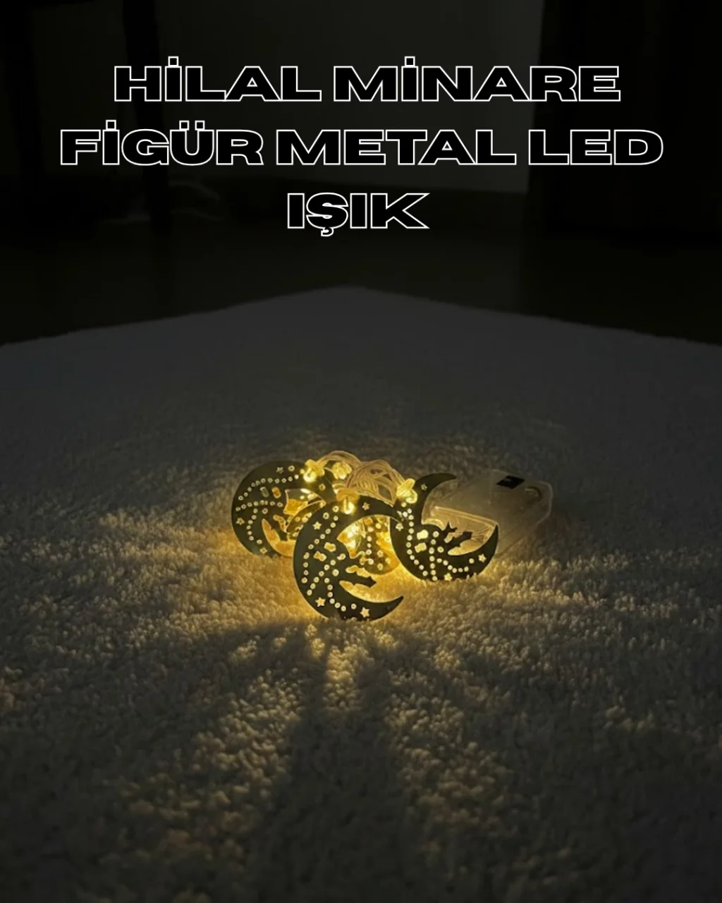 BUĞZ Gold Renk Metal Minareli Hilal LED Işık Pilli Ramazan Süsü