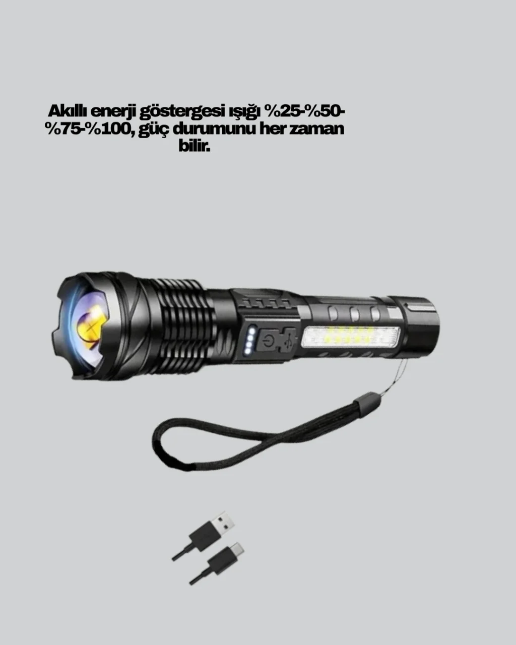 Şarjlı LED el feneri, güçlü ana LED’i ve yan COB ışığı ile çok yönlü kullanım sunar. Yan aydınlatma özelliği, tamirat ve yakın mesafe aydınlatmalarında büyük kolaylık sağlar. Yüksek lümen değeri sayesinde karanlık alanları kısa sürede aydınlatır.Ergonomik gövde tasarımı sayesinde elde rahat tutulur. Kamp, avcılık, balıkçılık ve araç içi kullanımlar için uygundur. Uzun süreli kullanım için tasarlanmış dayanıklı bir üründür.