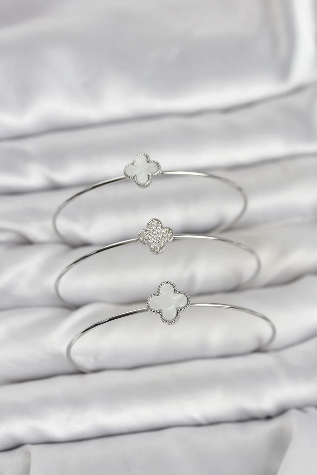 BUĞZ Gümüş Renk Yonca Model Zirkon Taşlı 3'lü Kadın Bileklik Kombini