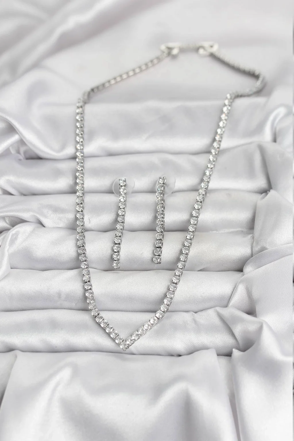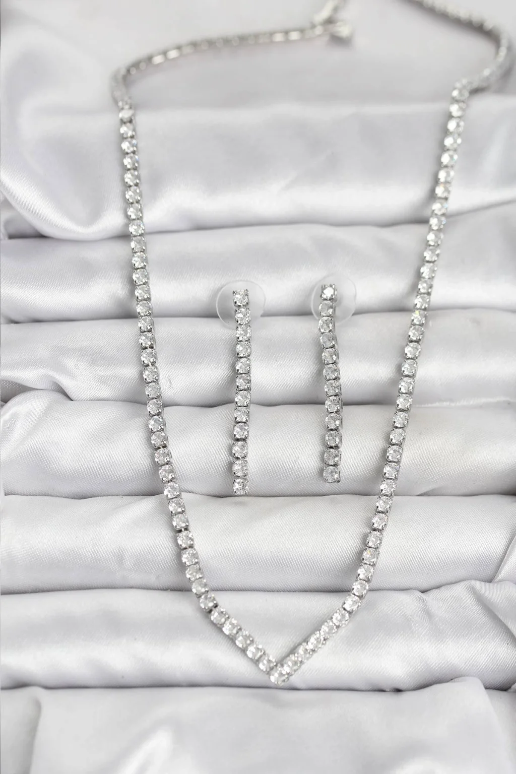 BUĞZ Gümüş Renk Zirkon Taşlı Kadın Kolye Küpe Seti - Lisinya