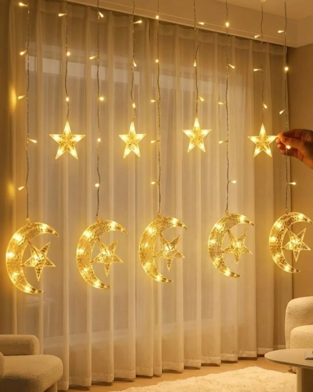 Hilal ve yıldız figürlü dekoratif perde ışık, yaşam alanlarınıza sadece bir aydınlatma değil, aynı zamanda duygusal bir ambiyans kazandırır. Sıcak beyaz tonuyla karanlık ortamda yumuşak ve romantik bir ışık yayarak bulunduğu mekâna huzurlu bir atmosfer oluşturur. Özellikle akşam saatlerinde tül perde önünde, pencere kenarında ya da duvar fonunda kullanıldığında ortama masalsı bir görünüm kazandırır.İki farklı aydınlatma modu sayesinde ister sabit ışık, ister yanıp sönen efekt tercih edebilirsiniz. Sabit mod daha sakin ve sofistike bir görünüm sunarken, yanıp sönen mod özel günlerde ve davetlerde enerjik bir hava oluşturur. Böylece ürünü hem günlük dekorasyonda hem de özel organizasyonlarda rahatlıkla kullanabilirsiniz.Yüksek kaliteli plastik gövde ve PVC kaplamalı kablo yapısı sayesinde hem dayanıklı hem de güvenlidir. Isıya karşı dirençli tasarımı sayesinde uzun süre açık kaldığında bile güvenli kullanım sağlar. Şık hilal ve yıldız tasarımı, modern ve geleneksel dekorasyon stilleriyle uyum sağlar.Ev, balkon, teras, restoran, vitrin, organizasyon alanları ve özel gün süslemelerinde rahatlıkla tercih edilebilir. Dekoratif yapısı sayesinde bulunduğu ortamı anında daha estetik ve sıcak bir görünüme kavuşturur.