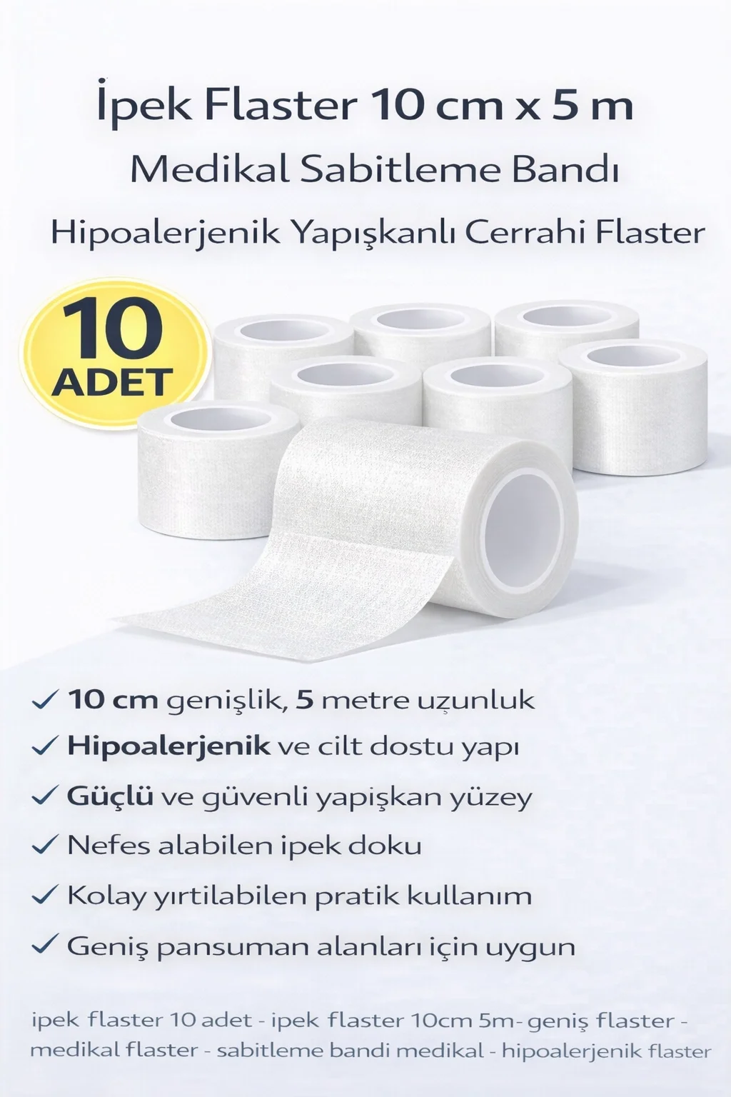 Ürün Açıklaması İpek flaster 10 cm x 5 m 10’lu paket, medikal kullanım için özel olarak üretilmiş, geniş yüzeyli ve güçlü yapışkanlı sabitleme bandıdır. Yumuşak ipek dokusu sayesinde hassas ciltlerde güvenle kullanılabilir ve uzun süreli sabitleme sağlar. Nefes alabilen yapısı cildin hava almasına yardımcı olur ve tahriş riskini azaltır. Kolay yırtılabilen tasarımı sayesinde makas gerektirmeden pratik kullanım sunar. Geniş ölçüsü sayesinde büyük pansuman alanlarının sabitlenmesi için idealdir. Hastane, klinik, ilk yardım çantası ve evde bakım uygulamalarında güvenle kullanılabilir. Çoklu paket içeriği sayesinde ekonomik ve uzun süreli kullanım sağlar. Ürün Özellikleri
