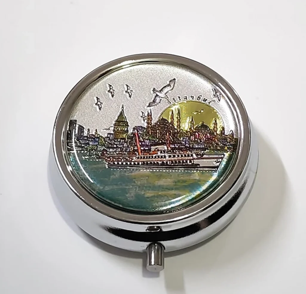 İSTANBUL TEMALI İLAÇ KUTUSU - MODEL 10 Ürün Özellikleriİstanbul Temalı İlaç Kutusu - Model 10, kompakt yapısı ve estetik tasarımı ile günlük kullanım için pratik bir saklama çözümü sunar. 5x5 cm ölçüsündeki küçük ve taşınabilir formu sayesinde çanta, cep ve seyahat çantasında rahatlıkla taşınabilir. Üzerinde yer alan İstanbul temalı tasarım detayı ürüne dekoratif bir görünüm kazandırır. İç kısmındaki üç bölmeli ilaç kutusu yapısı sayesinde tablet ve kapsüllerinizi düzenli şekilde ayırarak saklamanıza yardımcı olur. Dayanıklı gövde yapısı ile uzun süreli kullanım sunan bu taşınabilir ilaç saklama kutusu, hem işlevsel hem de şık bir aksesuardır.Ürün Teknik Özellikleri Özellik Açıklama Ürün Adı İstanbul Temalı İlaç Kutusu - Model 10 Model Model 10 Ölçü 5 x 5 cm Bölme 3 bölmeli Kullanım Alanı Tablet ve kapsül saklama Paket İçeriği1 adet İstanbul Temalı İlaç Kutusu - Model 10