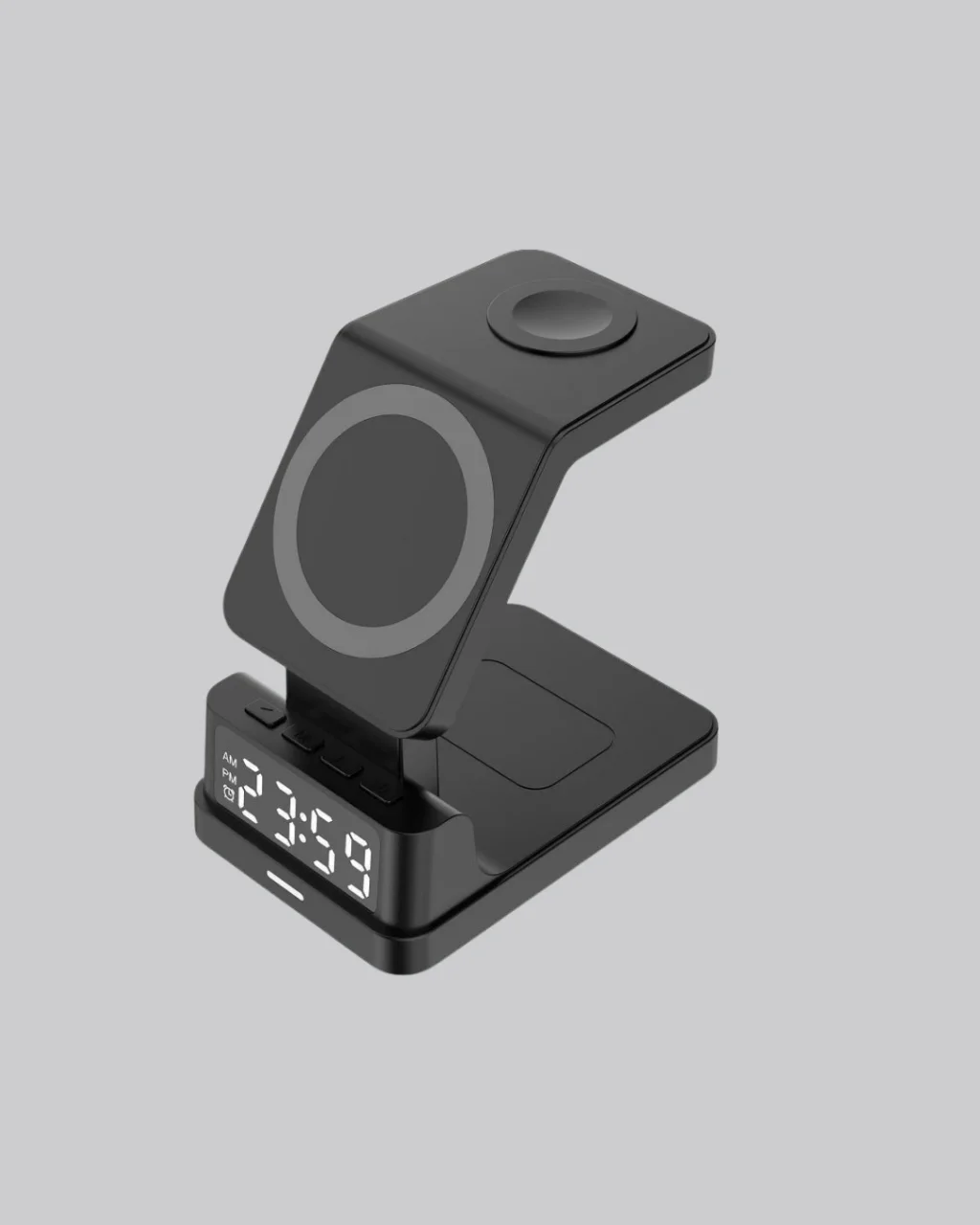 Tek cihazda şarj, saat ve zarafet!Bu dijital saatli kablosuz şarj cihazı, Apple ekosistemine uygun şekilde geliştirilmiş 4’ü 1 arada bir çözümdür.iPhone, Apple Watch ve AirPods cihazlarını eş zamanlı olarak şarj eder.3 seviyeli LED parlaklık kontrolü, ortam ışığına göre kolayca ayarlanabilir.İstersen gece lambası kadar yumuşak, istersen gündüz gibi parlak hale getirebilirsiniz.İçerisindeki bellek pili sayesinde elektrik kesintilerinde bile zaman bilgisi korunur.Akıllı çip teknolojisi, cihazları tanır ve her biri için en uygun şarj gücünü uygular.ABS malzeme ile üretilmiş yanmaz gövdesi, uzun süreli güvenli kullanım sağlar.Şık minimalist görünümüyle ofis masasında veya yatak başı sehpasında modern bir atmosfer oluşturur.