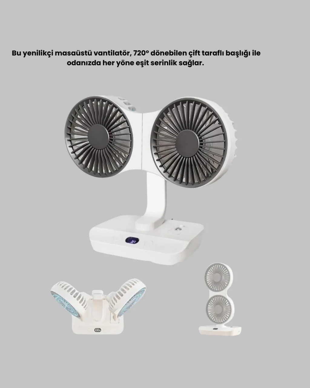 Bu kablosuz masaüstü fan, çift taraflı başlık tasarımı ve 720° dönebilir mekanizmasıyla bulunduğunuz ortamın her yönüne eşit serinlik sağlar.Yüksek performanslı motor sistemiyle güçlü hava akımı oluşturur, sessiz çalışması sayesinde gece kullanımlarında bile rahatsız etmez.USB şarj desteği, powerbank, laptop veya adaptör üzerinden kolayca enerji sağlar. Kablo derdi olmadan dilediğiniz yere taşıyabilir, ofis, yatak odası, kamp veya seyahatlerde kullanabilirsiniz.Uzun ömürlü batarya teknolojisi, tek şarjla saatlerce kesintisiz çalışma imkânı sunar.Gece lambası özelliği, fanın işlevselliğini artırır; loş bir aydınlatma sağlayarak yatak odalarında konforlu bir atmosfer oluşturur.Kaymaz tabanlı gövde, stabil bir duruş sağlar ve fanın devrilmesini engeller.Dilerseniz duvara monte ederek alandan tasarruf edebilirsiniz.Estetik görünümü, taşınabilir yapısı ve güçlü performansıyla bu fan, sıcak günlerin en pratik kurtarıcısıdır.Yazın serinliği, kışın ise hava sirkülasyonu için yıl boyunca kullanabileceğiniz çok yönlü bir üründür.