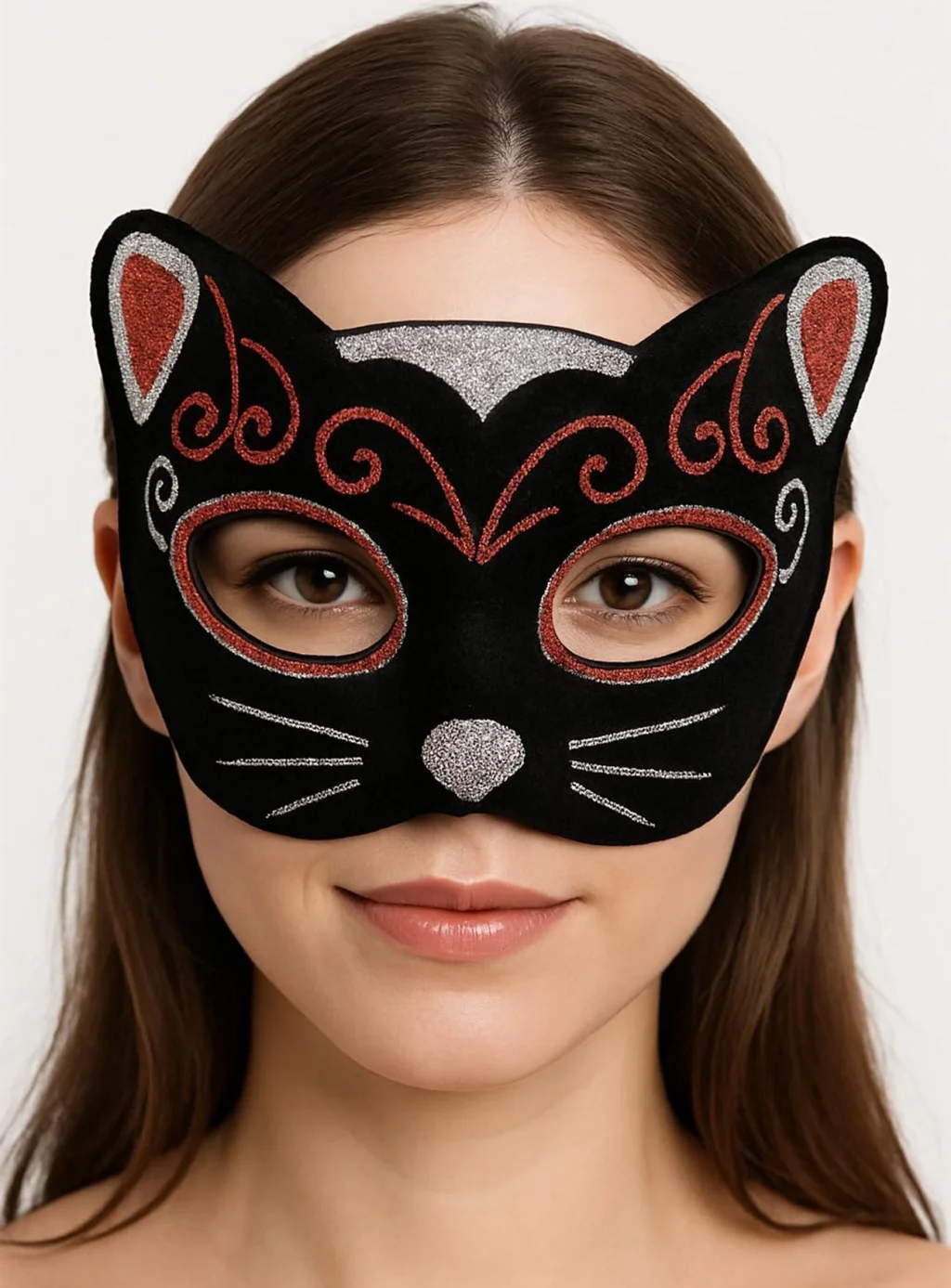BUĞZ Kadife Dokulu Sim Detaylı Işıltılı Kedi Maskesi Kırmızı Gümüş 20x13 cm