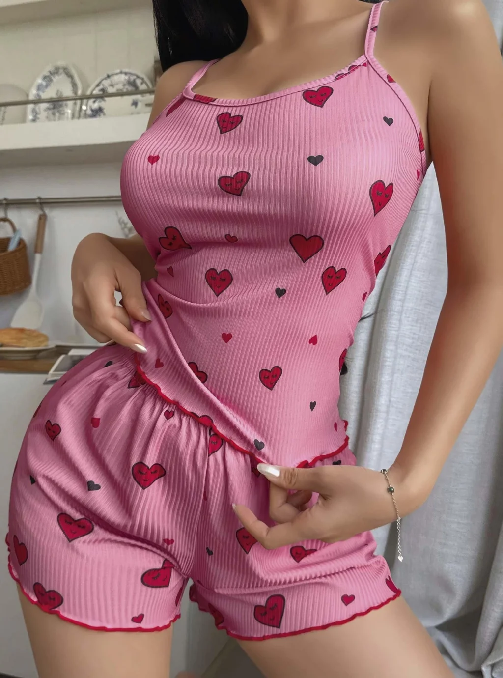 Pembe Kalp desenli bu Şortlu gecelik takımı, eğlenceli ve modern bir görünüm kazandırır. Yumuşak kumaşı sayesinde konforlu bir kullanım sunar.