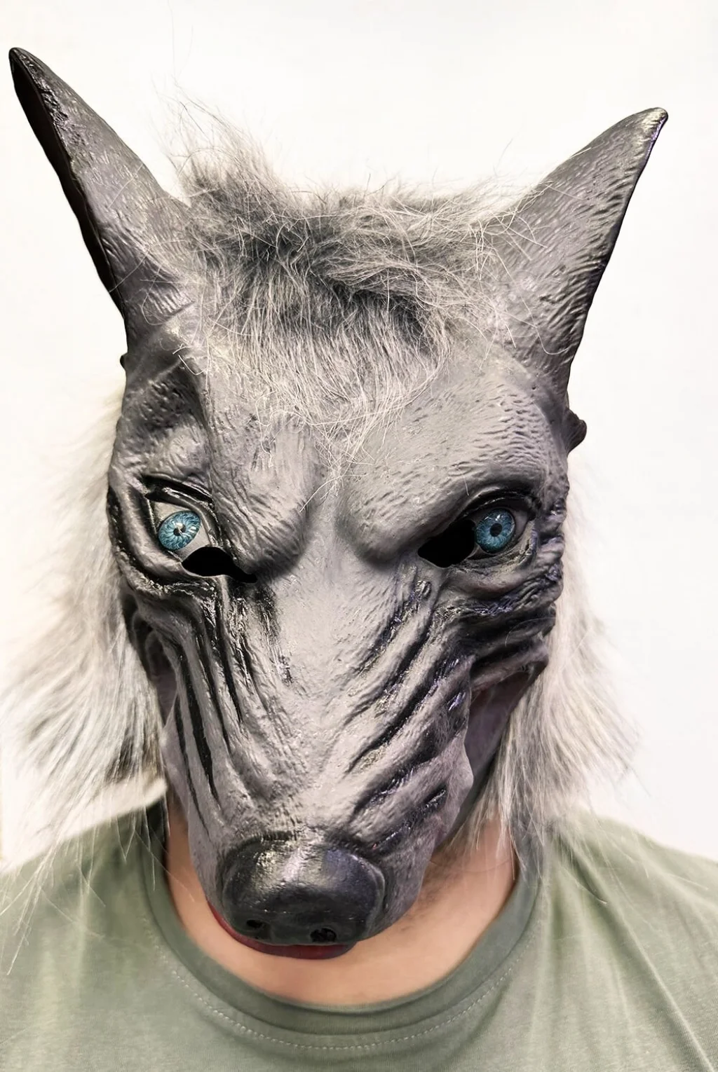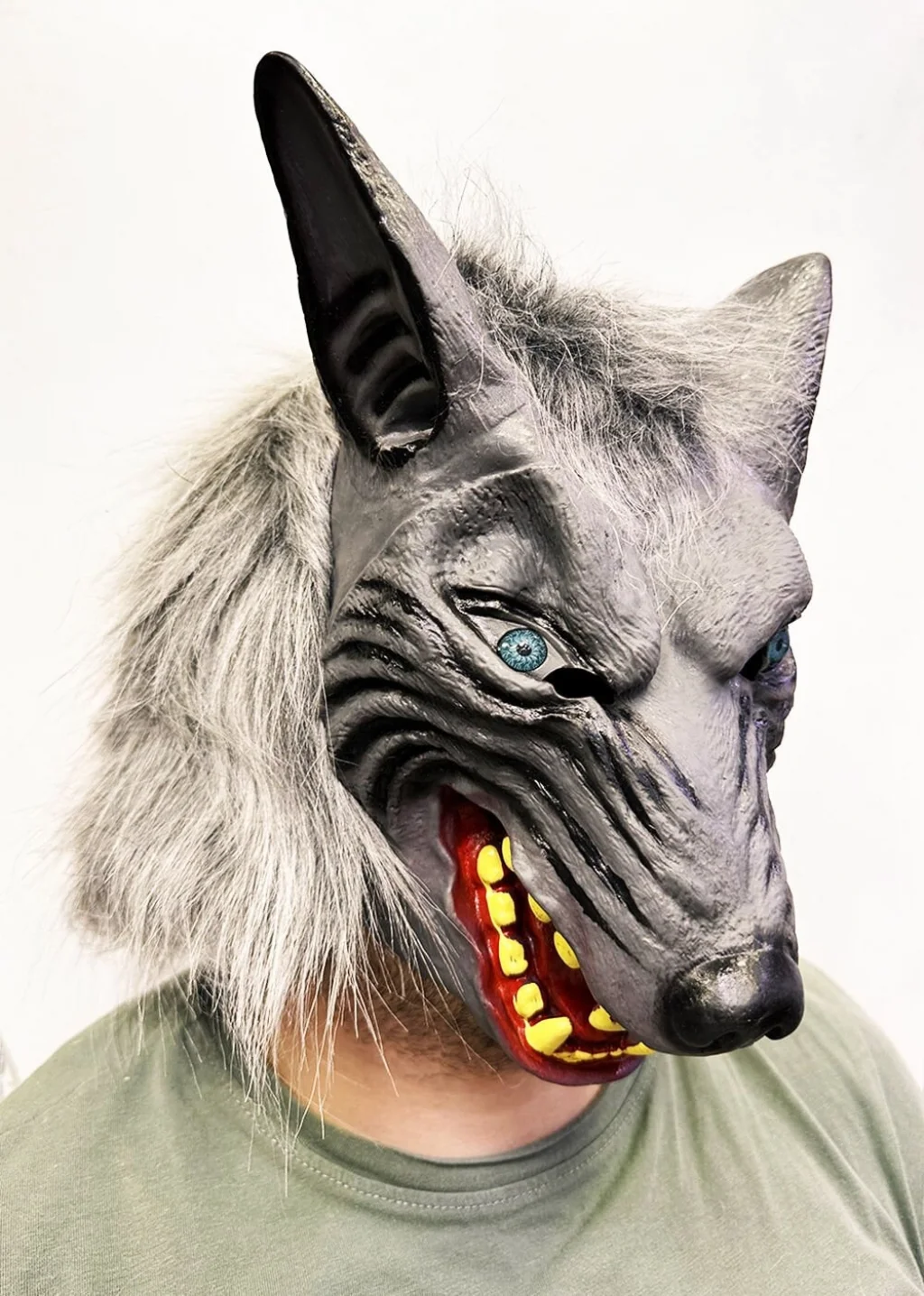 BUĞZ Kafaya Tam Geçmeli Lateks Mavi Gözlü Dişli Ağzı Açık Kurt Maskesi