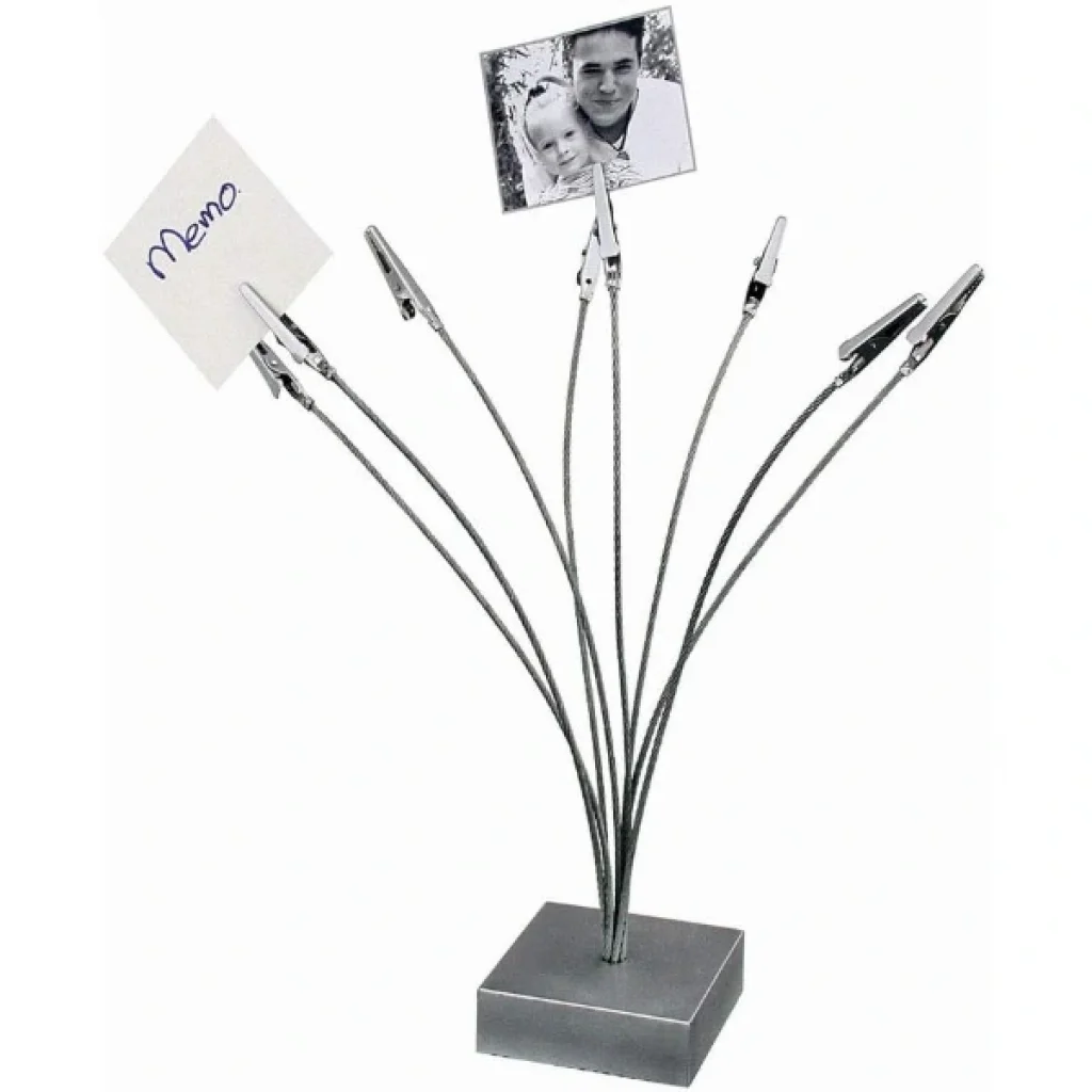 KAĞIT TUTACAĞI KISKAÇLIÜrün ÖzellikleriMasa düzeninizi korumanın en şık yollarından biri olan Kıskaçlı Kağıt Tutacağı, ofis, çalışma alanı veya resepsiyon masalarında pratik kullanım sağlar. 24x7 cm boyutlarındaki bu ürün, çoklu metal kıskaç sistemiyle notlarınızı, kartvizitlerinizi, fotoğraflarınızı veya önemli belgelerinizi düzenli şekilde sergilemenize imkân tanır.Esnek metal telleri sayesinde farklı yükseklik ve açıları kolayca ayarlayabilir, belgeleri estetik bir biçimde konumlandırabilirsiniz. Sağlam tabanı devrilmeyi önlerken, paslanmaz çelikten üretilmiş kıskaçları uzun ömürlü kullanım sunar. Minimalist ve modern tasarımıyla masa üstü dekorasyonuna da zarif bir dokunuş katar.Paket İçeriği1 adet Kıskaçlı Kağıt Tutacağı