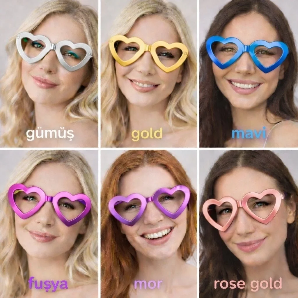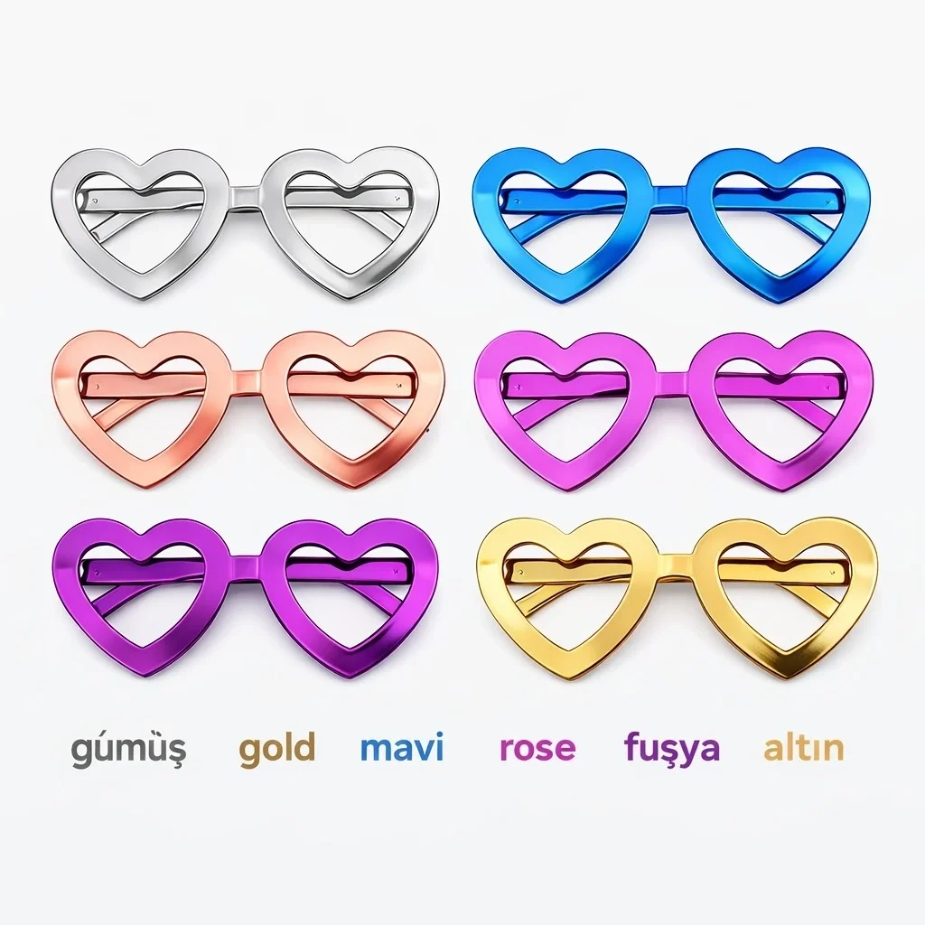 Kalp şekilli metalik parti gözlüğü, eğlenceli organizasyonlar ve özel günler için tasarlanmış dikkat çekici bir parti aksesuarıdır. Şık kalp formu sayesinde özellikle fotoğraf çekimlerinde ve parti atmosferinde eğlenceli bir görünüm sağlar.