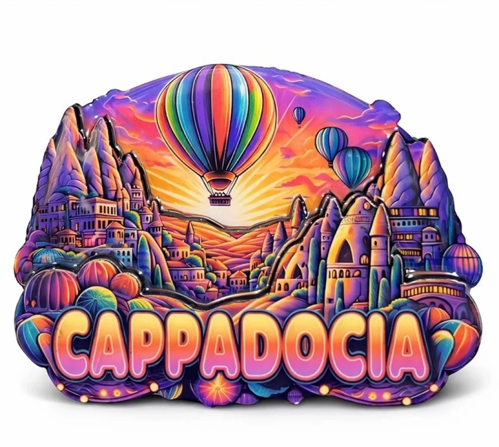 KAPADOKYA TEMALI AHŞAP BUZDOLABI MAGNETİ MODEL 2Ürün ÖzellikleriKapadokya temalı ahşap buzdolabı magneti Model 2, bölgenin simgesi haline gelen peri bacaları ve sıcak hava balonlarını canlı renkler ve detaylı çizimlerle yansıtan özel bir tasarıma sahiptir. Doğal ahşap malzemeden üretilmiş olması ürüne hem otantik hem de sıcak bir görünüm kazandırırken, dekoratif kullanım açısından da estetik bir bütünlük sunar. 10x7,5 cm ölçüsü sayesinde buzdolabı, metal pano, ofis dolabı veya manyetik yüzeylerde rahatlıkla kullanılabilir ve bulunduğu ortamda dikkat çekici bir görsel oluşturur. Arka kısmında yer alan güçlü mıknatıs yapısı, yüzeye sağlam şekilde tutunmasını sağlar ve günlük kullanımda düşme veya kayma yapmaz. Kapadokya’yı ziyaret edenler için anlamlı bir hatıra, sevdiklerine özel ve yöresel bir hediye ya da yaşam alanlarına kültürel bir dokunuş katmak isteyenler için ideal bir dekoratif üründür. Dayanıklı baskısı sayesinde renklerini uzun süre korur ve uzun ömürlü kullanım sunar.Paket İçeriği1 adet Kapadokya Temalı Ahşap Buzdolabı Magneti Model 2