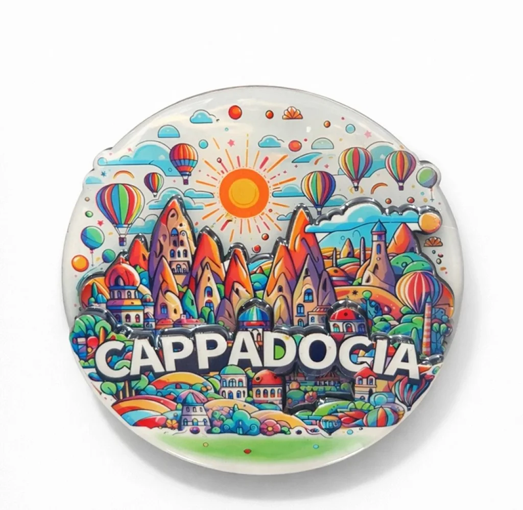 KAPADOKYA TEMALI AHŞAP BUZDOLABI MAGNETİ MODEL 3Ürün ÖzellikleriKapadokya temalı ahşap buzdolabı magneti Model 3, bölgenin eşsiz doğal güzelliklerini ve kültürel dokusunu yansıtan canlı ve detaylı bir tasarıma sahiptir. Doğal ahşap malzeme kullanılarak üretilmiş olması ürüne sıcak, otantik ve dekoratif bir görünüm kazandırır. 8x8 cm ölçüsü sayesinde hem kompakt hem de dikkat çekici bir form sunar; buzdolabı, metal pano, ofis dolabı ve benzeri manyetik yüzeylerde rahatlıkla kullanılabilir. Güçlü mıknatıs yapısı sayesinde yüzeye sağlam şekilde tutunur ve günlük kullanımda kayma ya da düşme yapmaz. Dayanıklı baskı tekniği ile üretilmiş olup renklerini uzun süre korur. Kapadokya’yı anımsatan özel bir hatıra arayanlar, sevdiklerine yöresel ve anlamlı bir hediye vermek isteyenler veya yaşam alanlarına kültürel bir dokunuş katmak isteyenler için ideal bir dekoratif üründür.Paket İçeriği1 adet Kapadokya Temalı Ahşap Buzdolabı Magneti Model 3
